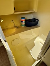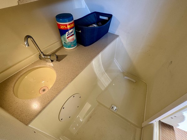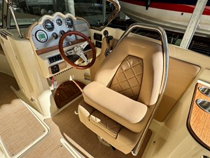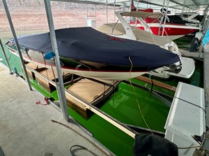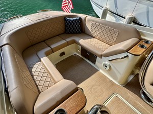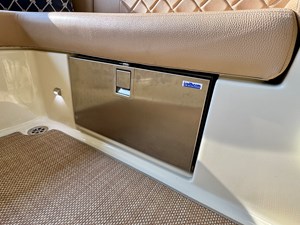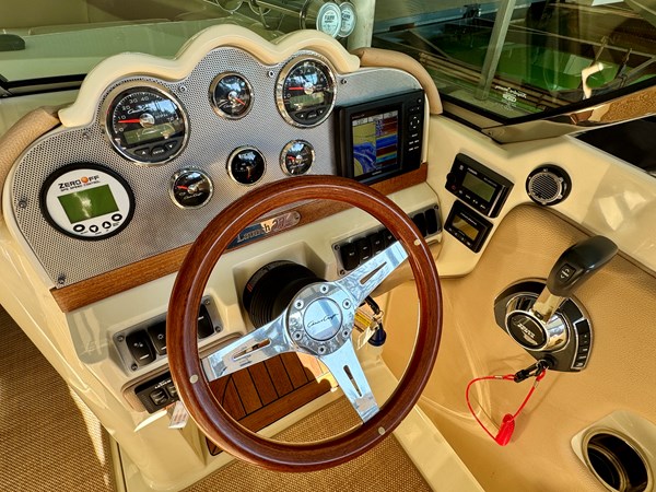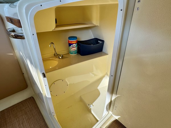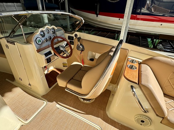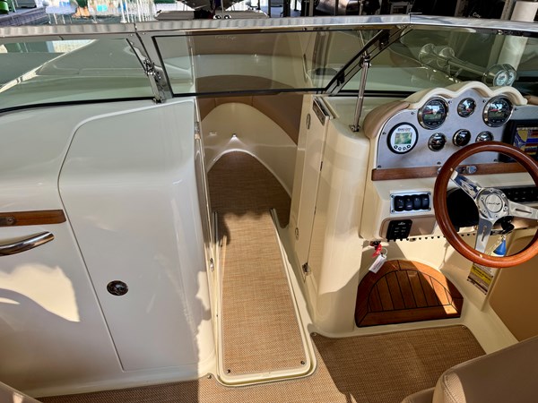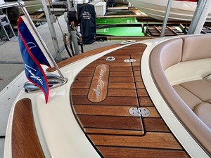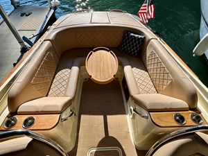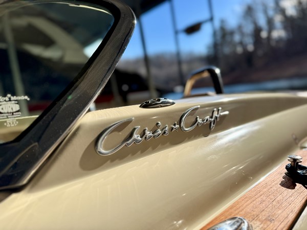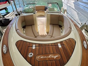 This One-Owner, Fresh Water, 2018 Chris Craft Launch 27 Heritage Trim Edition Wake Surf Boat For Sale on Norris Lake Tennessee is equipped with a 5.3L Volvo Penta V8 350HP inboard/outboard engine with a forward facing duo prop outdrive and features Zero-Off cruise control, Wake Worx surf tabs, pop-out ski tow hook, a head compartment with removable porta-potti (not shown), mooring cover, hide-away bimini top, snap-in flooring, a Lewmar windlass anchor, a Fusion stereo w/JL Audio speakers, Garmin GPS/chartplotter/depth/fish finder/sonar, engine & fuel economy displays, digital throttle and shift controller, power assisted steering, flip-up driver and passenger seats, under water lights, docking lights, teak accents throughout including a teak swim platform and teak removable lounge table, a pull-out transom shower, transom walk-through and step with filler cushions, an IsoTherm 12volt refrigerator/cooler, powered engine hatch, dual batteries with battery switch and onboard battery charger, an automatic fire suppression system, galvanic isolator, stainless steel dual trumpet horns, and much more!