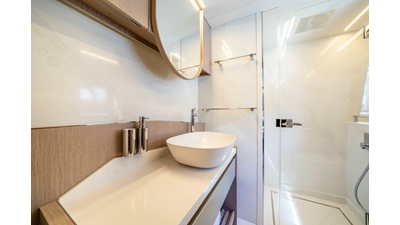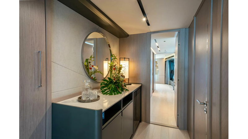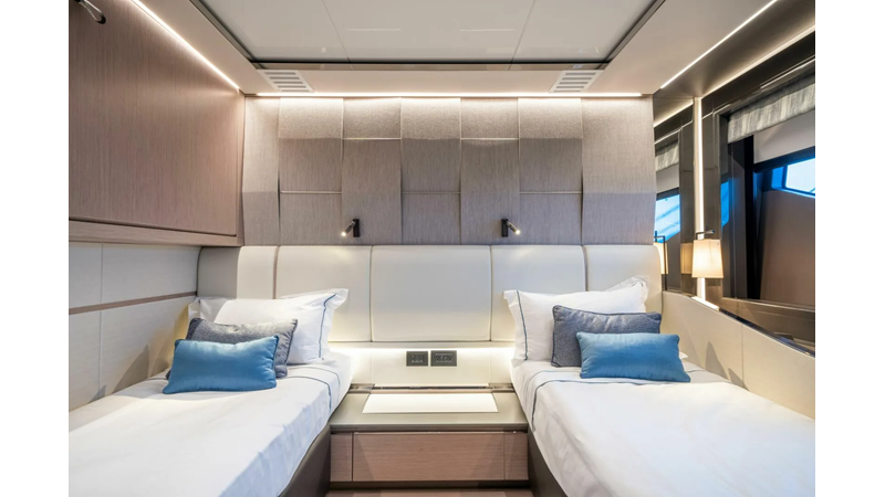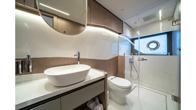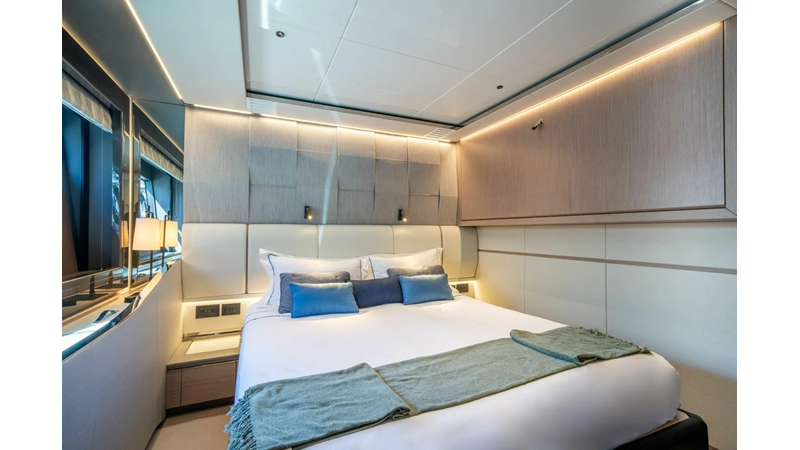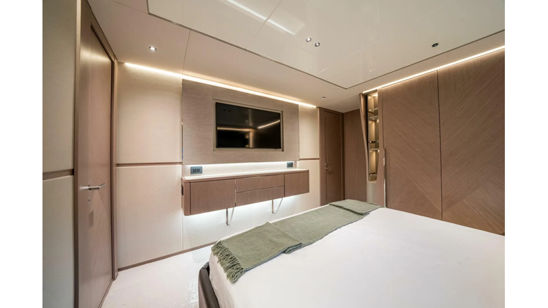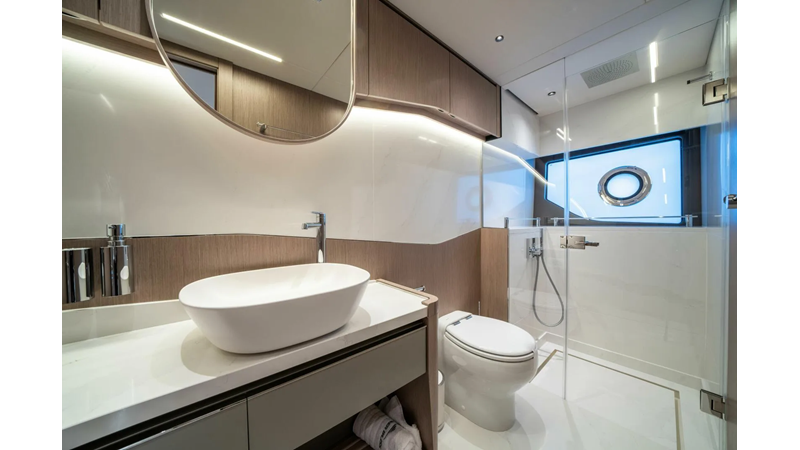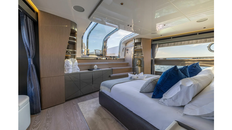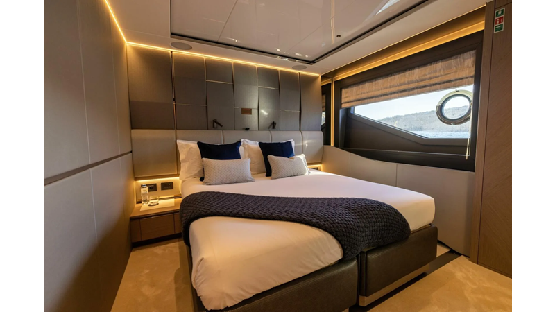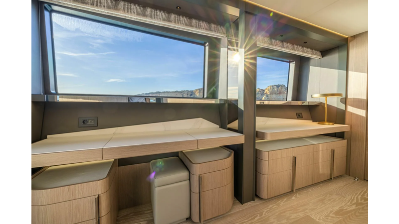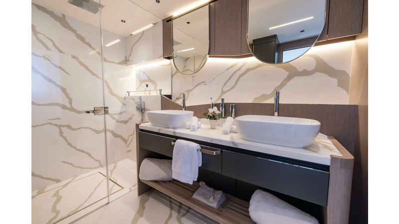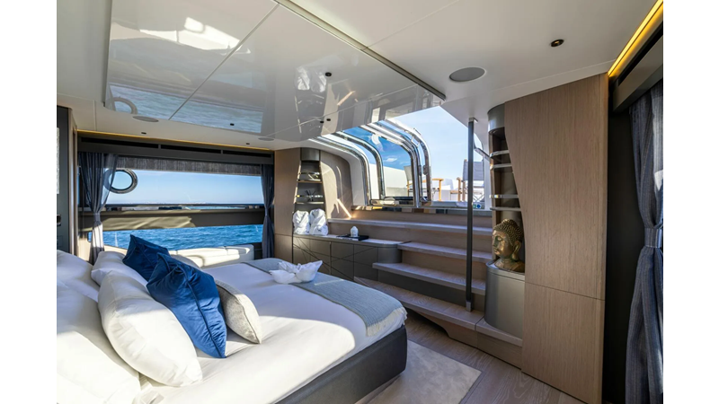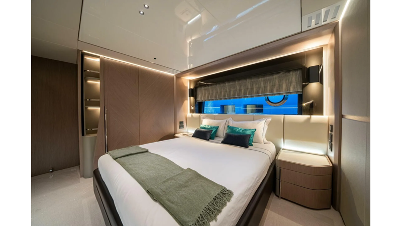 The unique main deck layout includes the Owner's Stateroom forward for even greater flexibility and freedom on board. This full-beam stateroom offers a large lobby entrance, walk-in wardrobe with feature shelving, an office and generous en suite. Bathed in natural light courtesy of expansive panoramic glazing, owners can access a first-in-class bow terrace for ultimate privacy through a cleverly sculptured, fully-glazed sliding door forward. The crew cabin is also worthy of mention, featuring a Captain’s cabin with en suite, two twins each with en suite, a highly specified crew mess.
