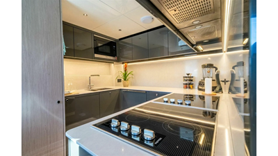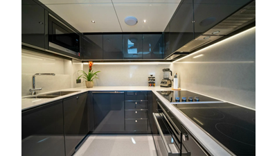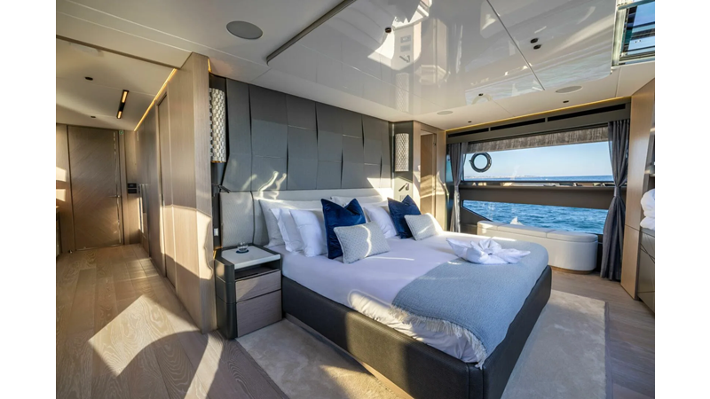 Its unique main deck, penthouse-style saloon and luxurious staterooms offer a new-found design direction and material selection providing elegant interiors to enchant any owner. The layering of textural elements and the mix of furnishings and fabrics feels timeless with a modern twist that exudes simplicity and sophistication. Floor-to-ceiling glazing floods the generous saloon with natural daylight, complemented by sliding doors to starboard, helping to bring the outdoors in. A stunning feature wall forward of the dining room showcases exposed and seemingly floating stair treads leading to the wheelhouse above on the port side and lower deck access to starboard. The large, fully equipped galley forward is concealed behind a feature bulkhead, and offers plentiful space and direct side deck access for crew.