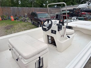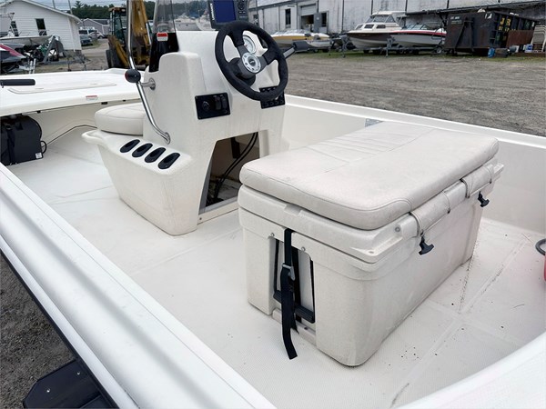 This 17-foot center console skiff is ideal for shallow water fishing and cruising, whether in freshwater or saltwater. Built with Mako’s signature inverted V hull, it offers excellent stability and performance with minimal horsepower. The layout includes a molded center console with an integrated baitwell, ample storage, and wide fishing platforms at the bow and stern.