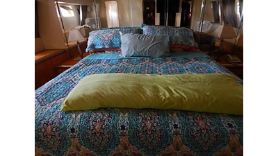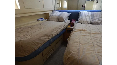Full beam master, with a king size bed, VIP state room with a queen size bed, guest state room with two single beds, and Captains quarters /office with a single bed, and crew, quarters with two single beds.