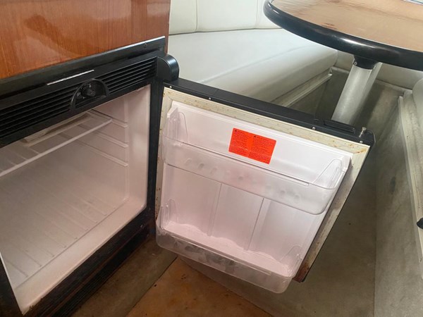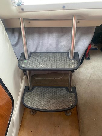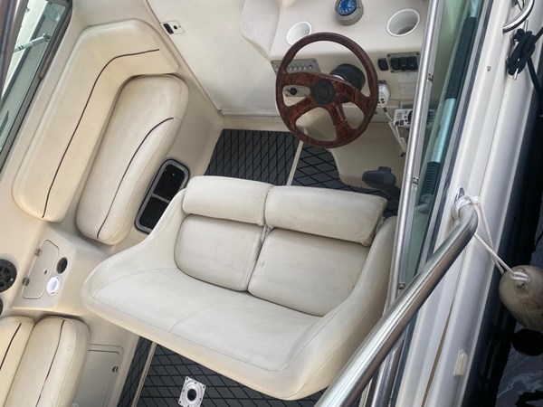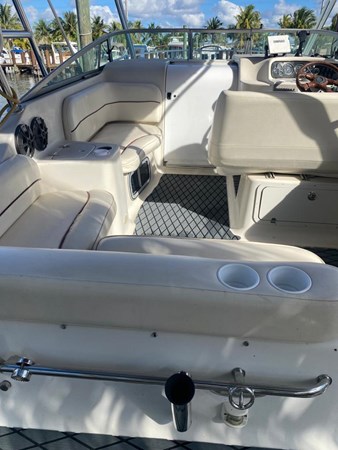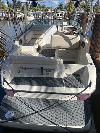 The boat has an enclosure battery charger, depth sounder, GPS, and color-fixed Mount. Stereo AM/FM/CD PLAYER, refrigerator, batteries, docking lights, swim fiberglass platform, trim tabs.