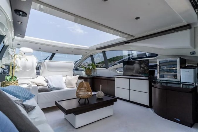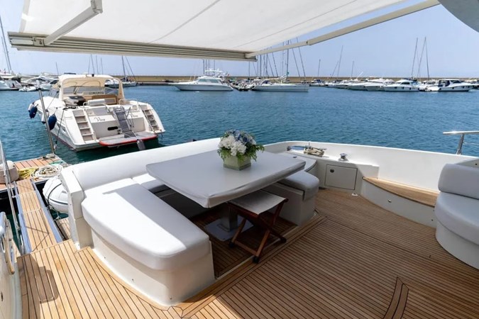 The yacht offers luxurious and elegantly appointed interiors, featuring a spacious main salon with Etro leather sofas and wengé flooring complemented by a new custom carpet. The area includes an extendable and telescopic dining table, a bar cabinet with retractable Hisense smart TV, Create wine cooler, and a high-fidelity audio system. The helm station is equipped with an electrically adjustable pilot seat.