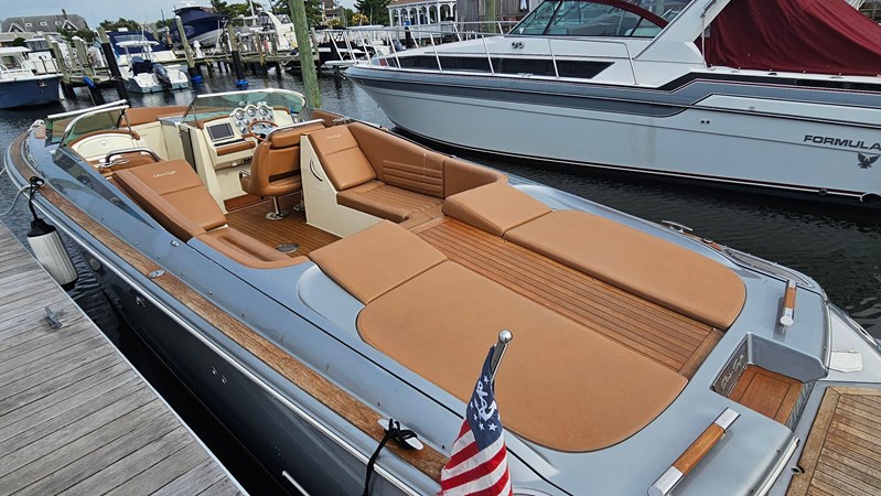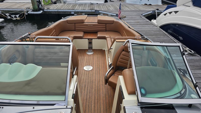 This one owner Chris Craft Launch 32 is a classy and elegant runabout. It's the perfect bowrider for family and friends. The Silver Bullet Metallic painted hull with the tumblehome stern, the Toffee color upholstery, the Heritage Teak Packager, the classic polished stainless steel windshield frames and the bow flare let everyone know that it is a Chris Craft.