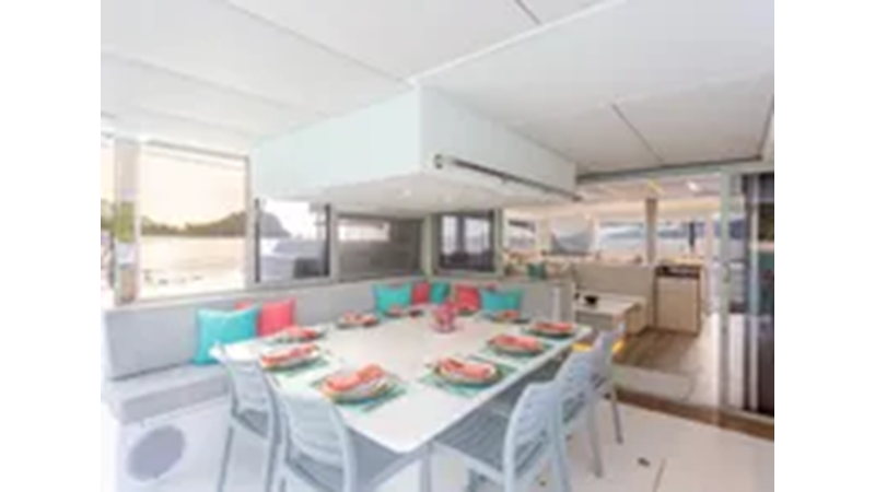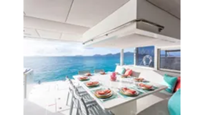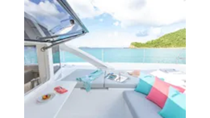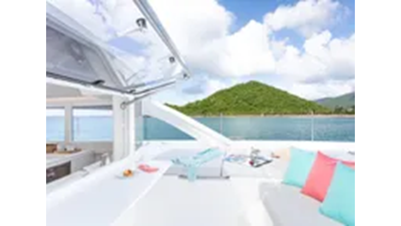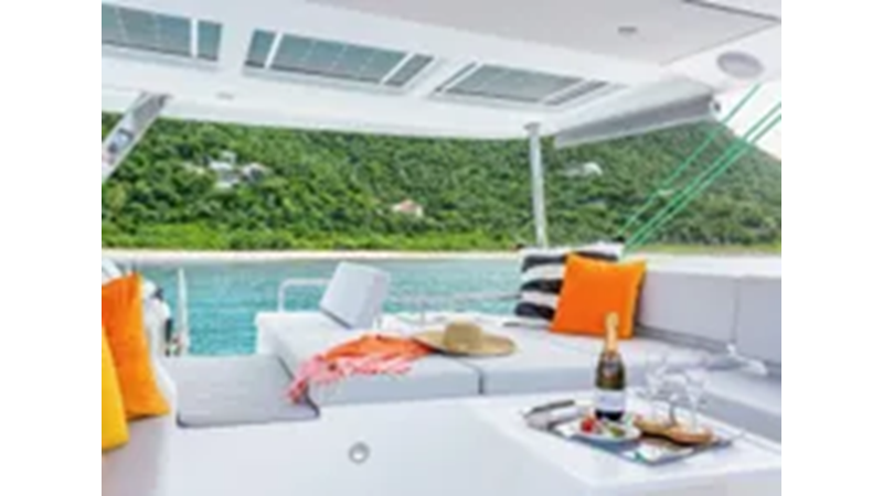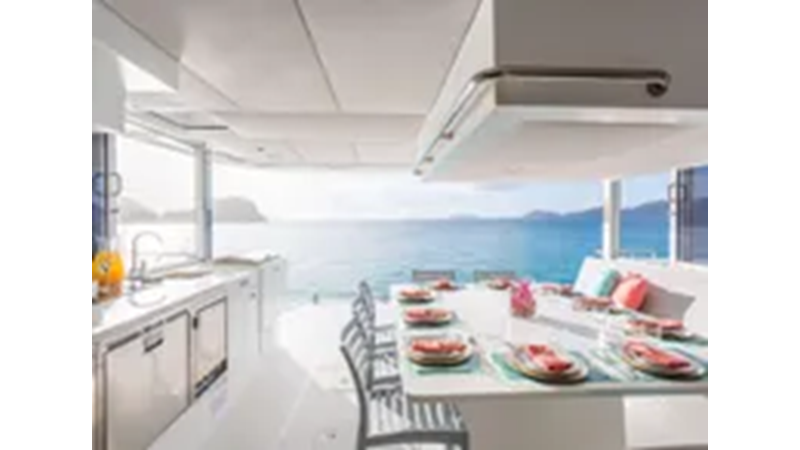 Entertainment areas include a large dining area in the aft cockpit with wet bar and bbq grill, interior lounge adjacent to the galley with 360 degree views of the exterior, forward lounge with bar counter sofa and sun beds, and a huge flybridge lounge with day bed, sofa benches, and coffee table, completely under the shade of the bimini, covered with solar panels.