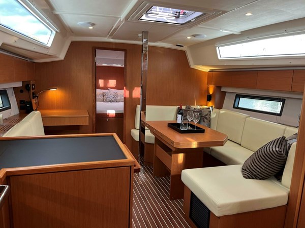 This model offers a well-appointed 3-cabin, 2-head layout, including a master cabin with a double berth and ensuite head. The twin aft cabins also feature double berths, ensuring comfort for guests. The salon, finished in luxurious Mahogany and Ocean Line flooring, is bright and airy, thanks to large hull windows and premium “Opus” artificial leather upholstery.