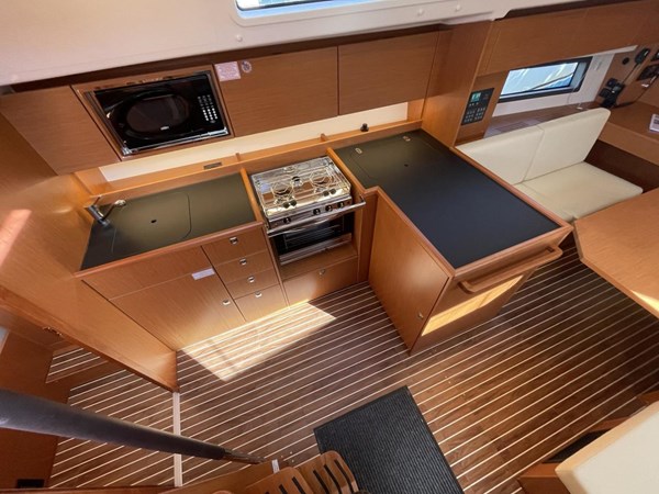 The fully equipped L-shaped galley boasts a 3-burner stove with an oven, microwave, and front-loading refrigerator, providing all the amenities needed for extended stays on the water. Climate control is handled by two separate air conditioning units, ensuring comfort in any weather.