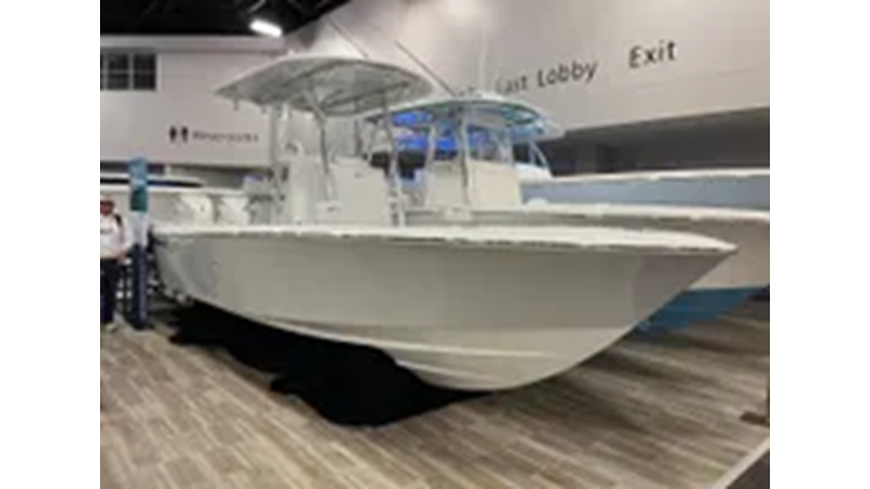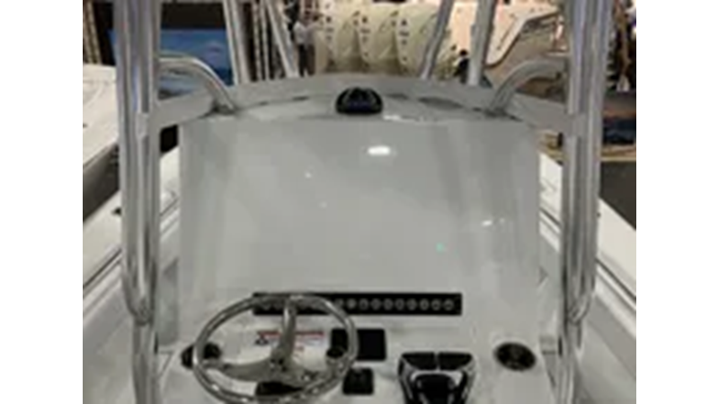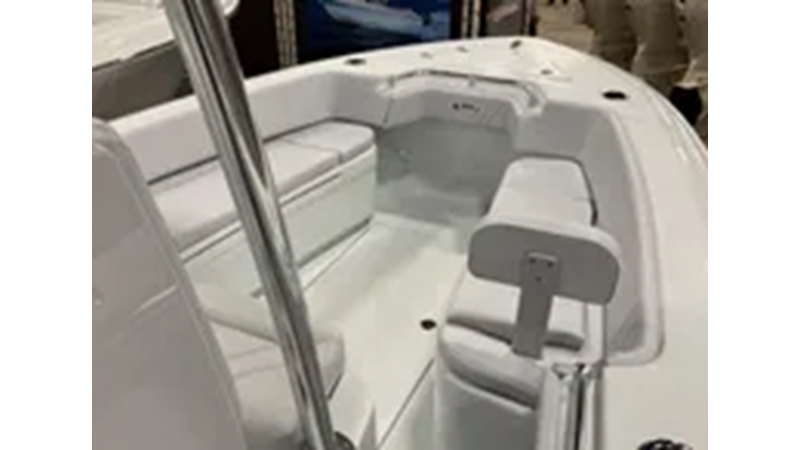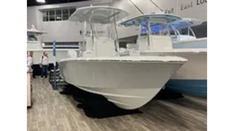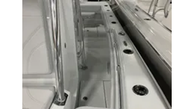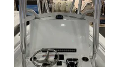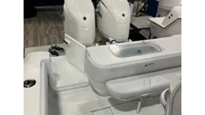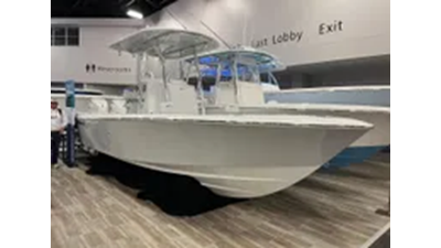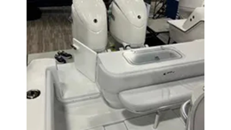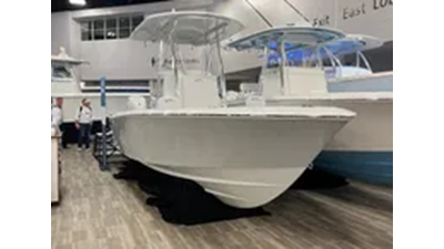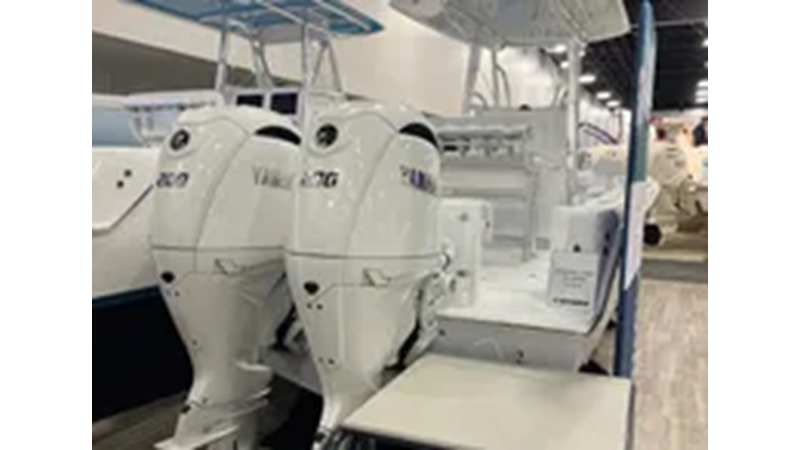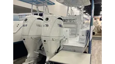 Twin White Yamaha F200's w/ Digital Controls and Integrated Electro-Hydraulic Steering M-Series Console M-Series T-Top Hard Top Yamaha CL5 Display Whisper Gray Hull with White Bottom Light Gray Cushions with Baseball Stitching