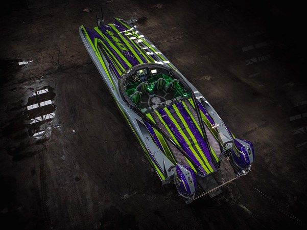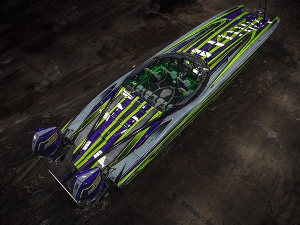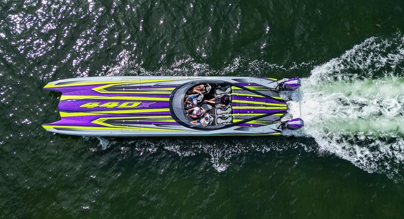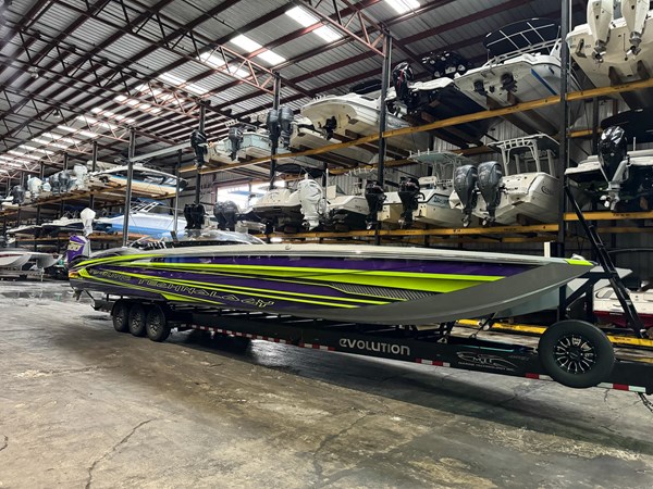 2024 MTI 440X powered by twin Mercury Racing 500R’s with approx. 20 hours. Black painted aluminum Evolution Trailer.