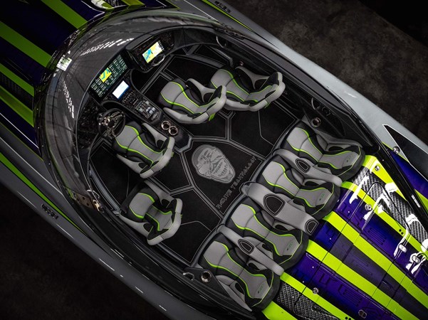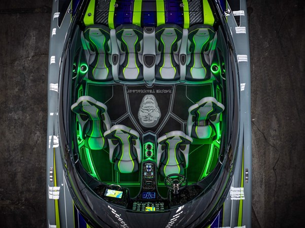 Carbon Fiber Hull and Deck. Custom Gel coat bottom and painted cockpit to match. Upholstered wrapped dash. Forged Carbon fiber dash panels. 8 Seat configuration. SeaDek flooring and Seadek inside the storage compartments. Garmin 22 inch in the center and a Garmin 12 inch on the passenger side. Stereo stage 2. Underwater lighting. Upgraded Seasmart Polished Stainless Steel Cleats. Cellphone docking charging pods.