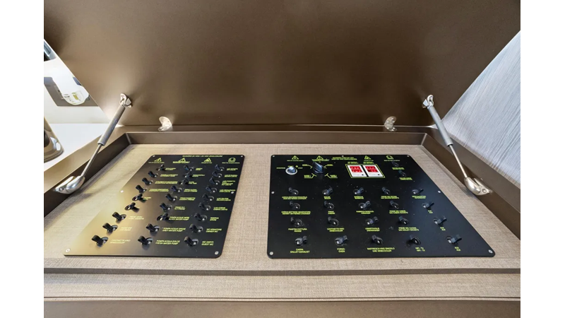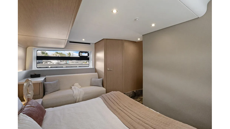 The main deck is a unique, large and wide-ranging area, laid out nearly flush for a full-length airy feeling. The elongated windows further enhance the perception of space, maximizing natural light and views. The galley is located aft at the entry to serve both indoor and outdoor social areas with ease.