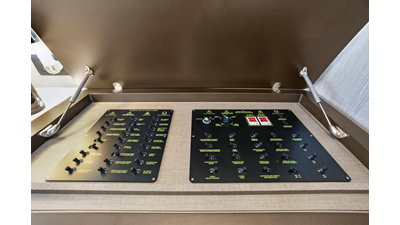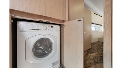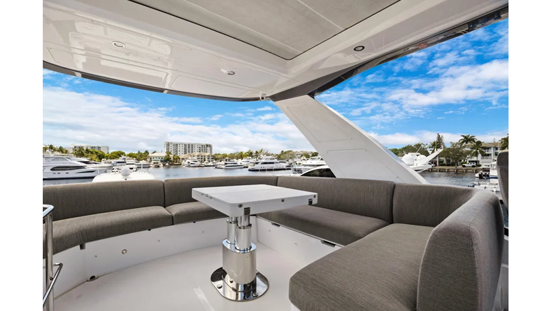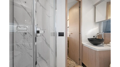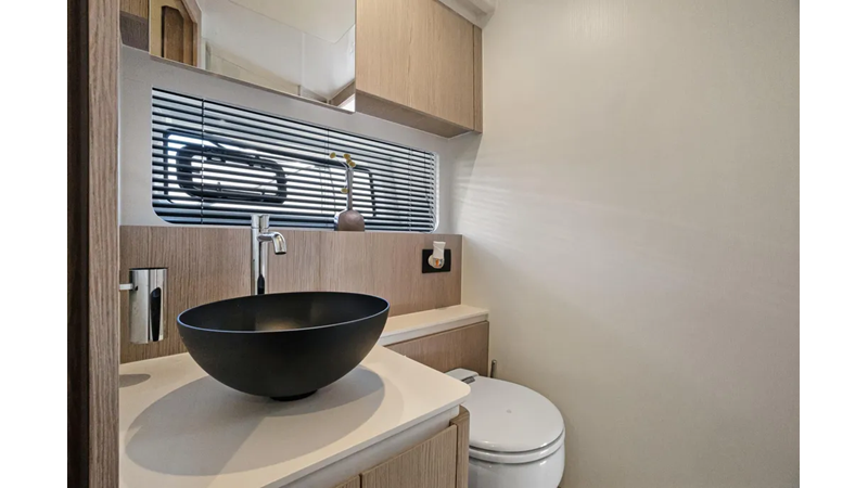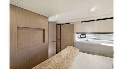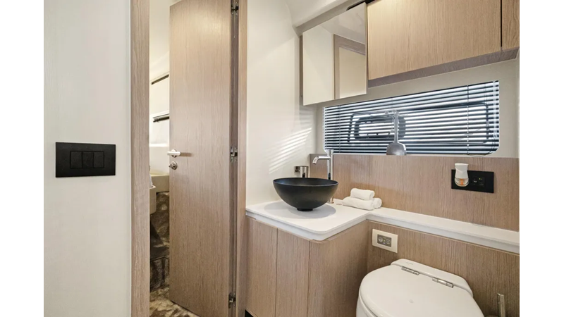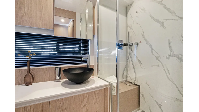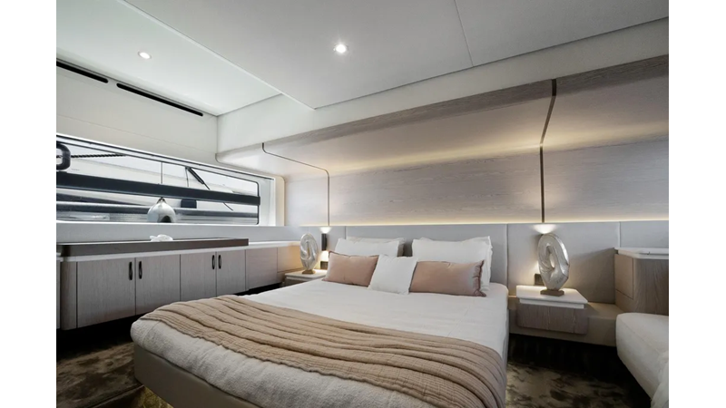 Reclining backrests transform the bow sunbeds into plush chaise lounges that look towards the stern, facilitating conversation between the owner-captain and guests. The tinted windshield wraps around the whole area, which can therefore be enjoyed even under way. Services comes by way of a central bar cabinet. An all-ecompassing lounge over the waves occupies the flybridge’s aft half, set around a convertible coffee table for dreamy rooftop dining. The owner may choose to shade this area with a manual or an electro-hydraulic bimini.