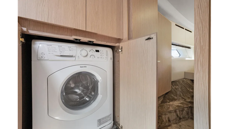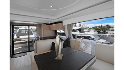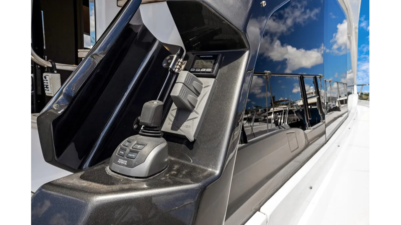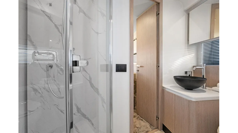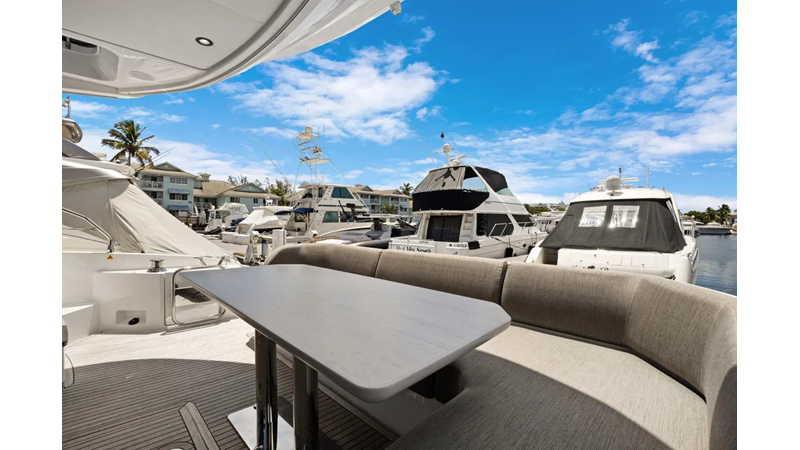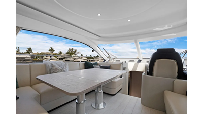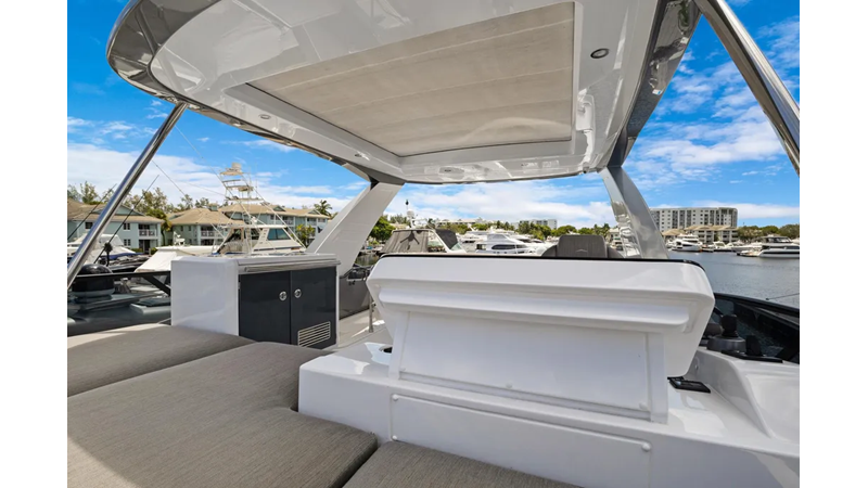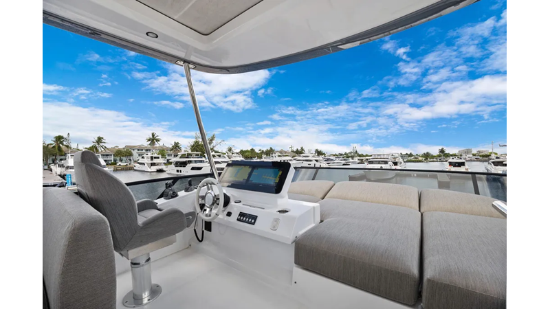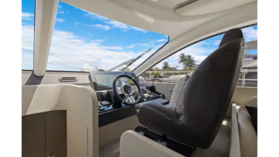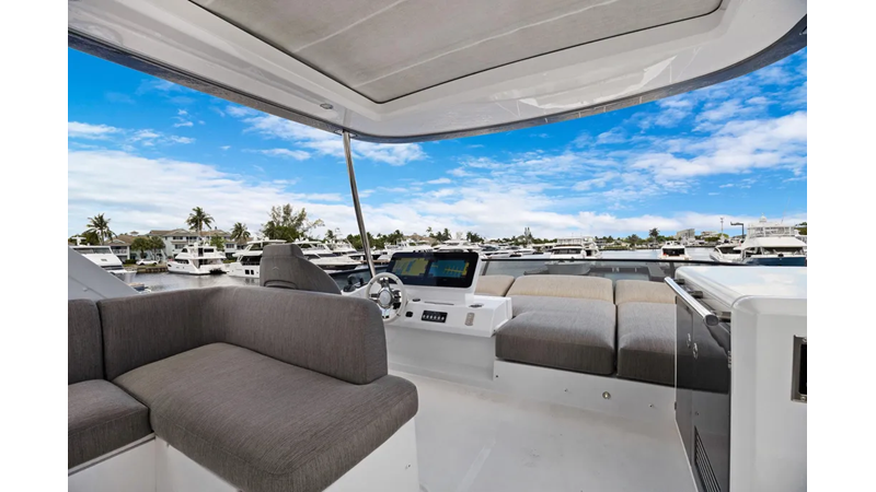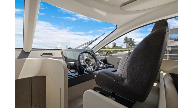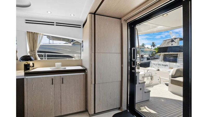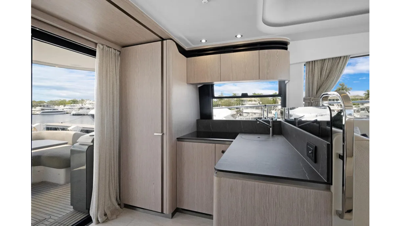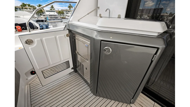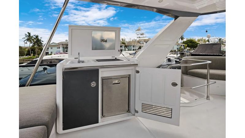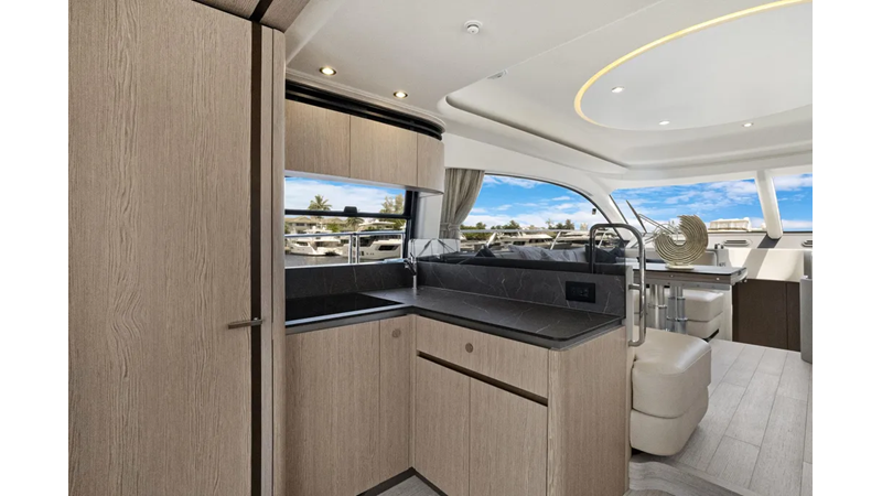The cockpit is designed with space and convenience in mind. The asymmetrical transom keeps efficient footpaths, while extending the cockpit table and seating. The new size adds an extra dimension of comfort to the sheltered seaside spot, which features a bar cabinet with a sink, an ice maker and two bottle chillers. The galley fridge is thoughtfully stationed within reach.