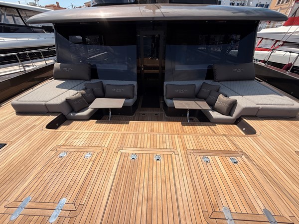 The expansive flybridge is a true highlight, offering multiple seating areas, sun pads, and a fully equipped wet bar, perfect for enjoying life at sea. All decks are finished in natural teak, creating a warm and luxurious outdoor environment. A hydraulic swim platform (700-900 kg capacity) enhances ease of water access and tender deployment.