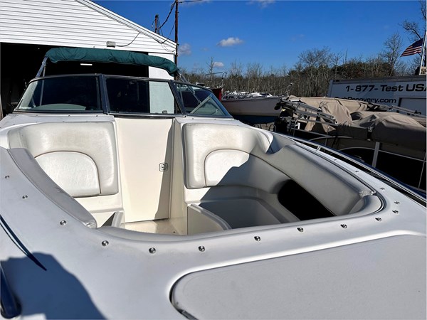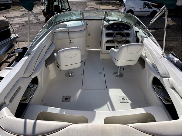 Aft seating and a sun pad make this an ideal family day boat. There are cozy lounge seats and a walk-through windscreen in the bow section. Bucket seats with bolsters serve as helms and companion seats.