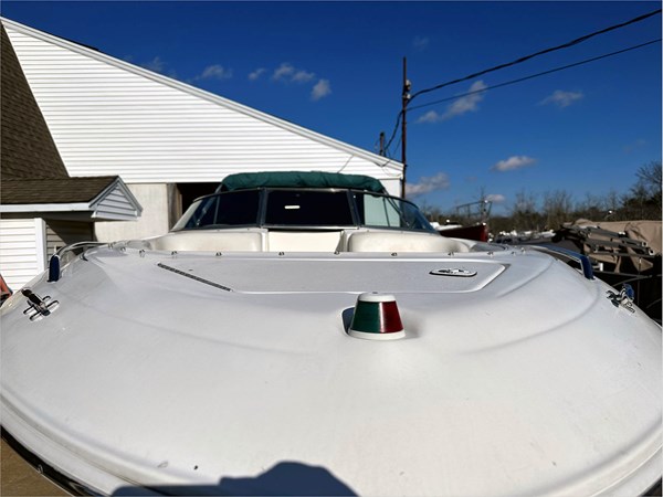 The dash area's enclosed head is on the port side. With a 310 horsepower Mercury engine that starts easily, the boat operates effectively.