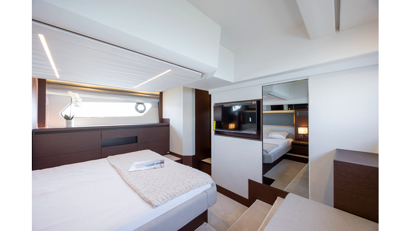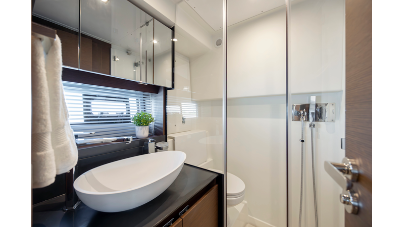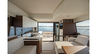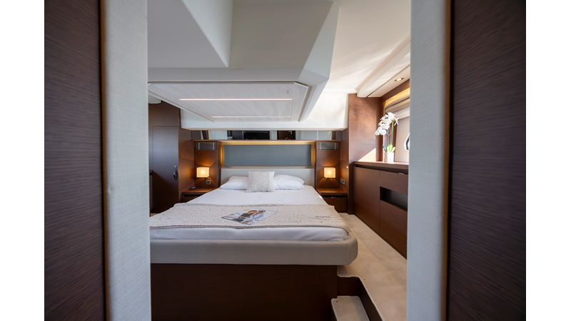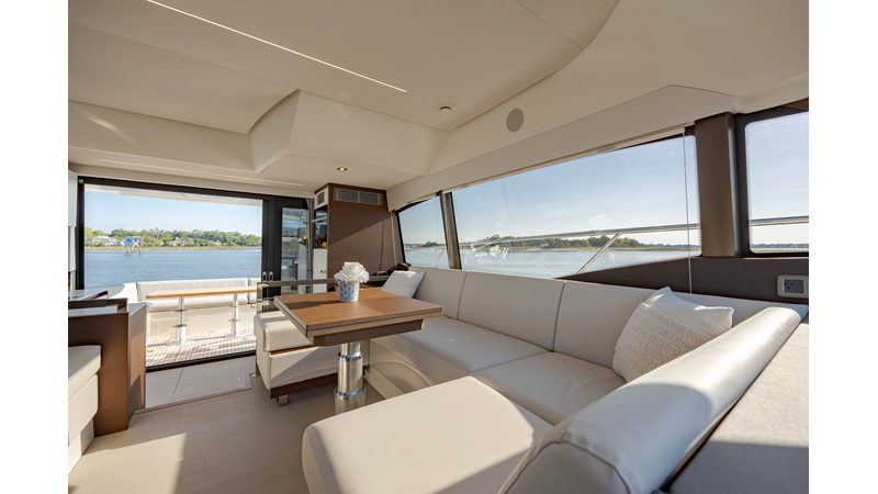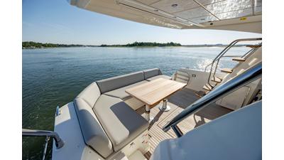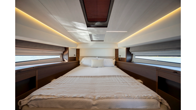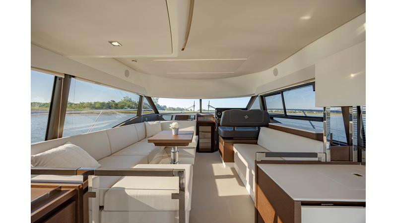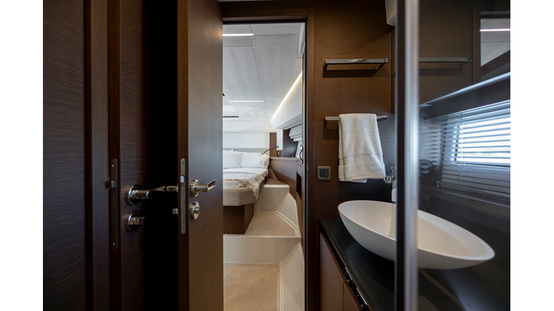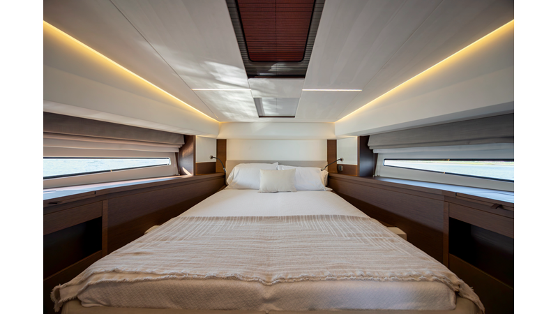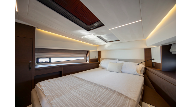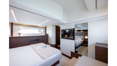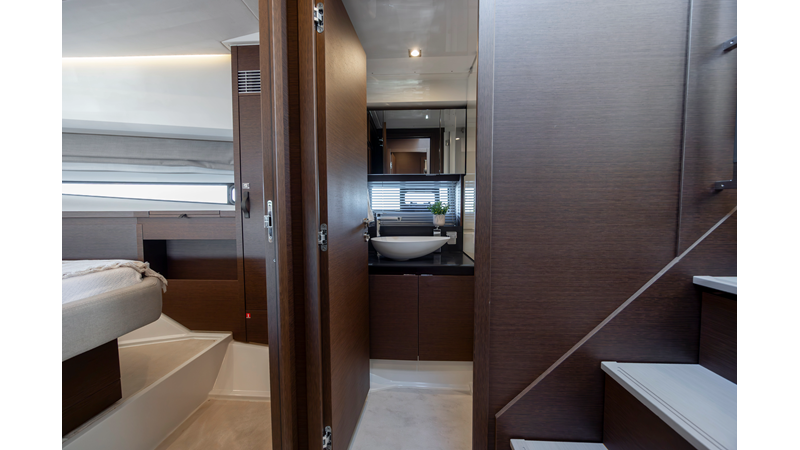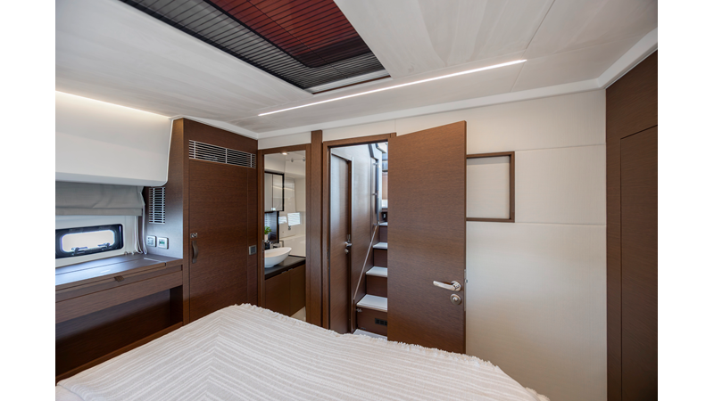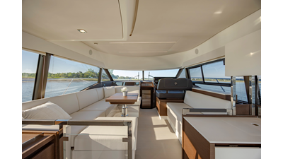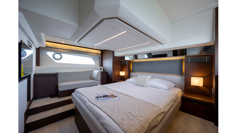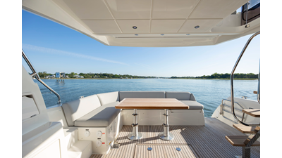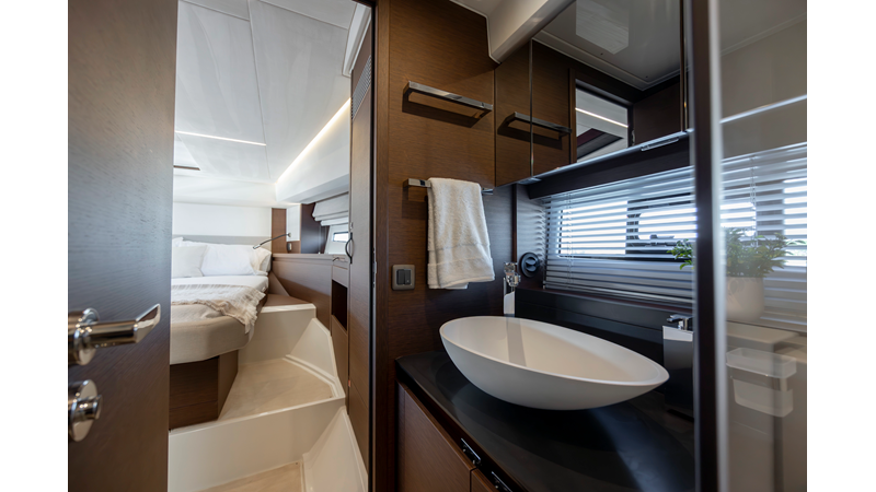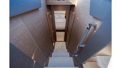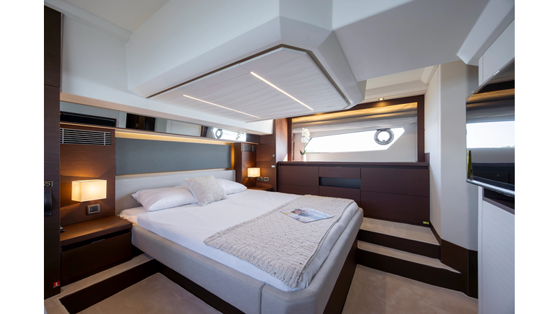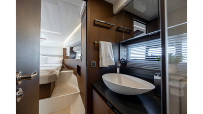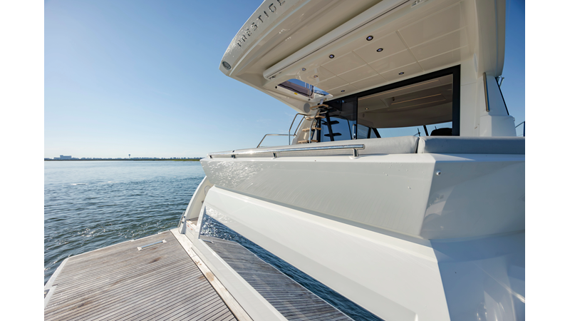 On the exterior, she features the signature style of the latest PRESTIGE Yachts, with an expanded, continuous line of windows in the hull. This Flybridge integrates the concept of the L-shaped cockpit, which allows for maximum use of space. Transformable into a very large aft sundeck, this cockpit can also house a fully equipped skipper cabin.