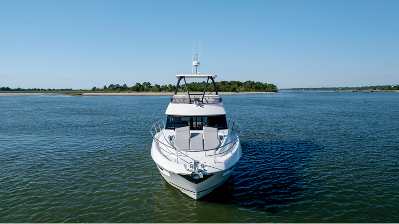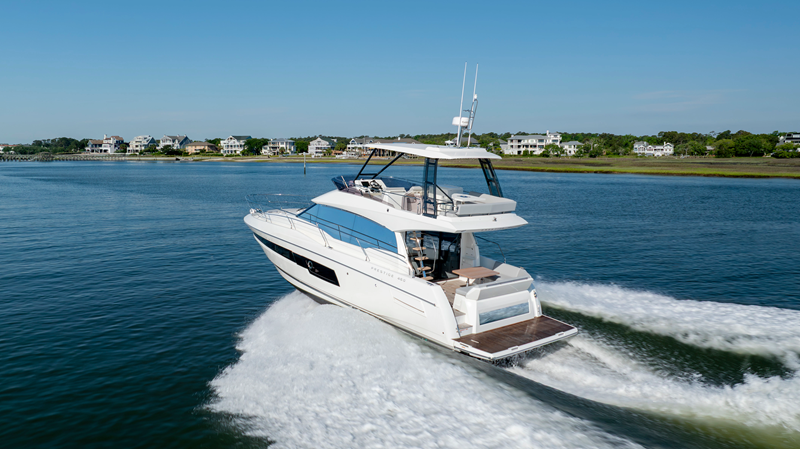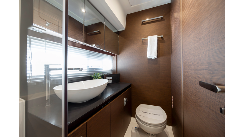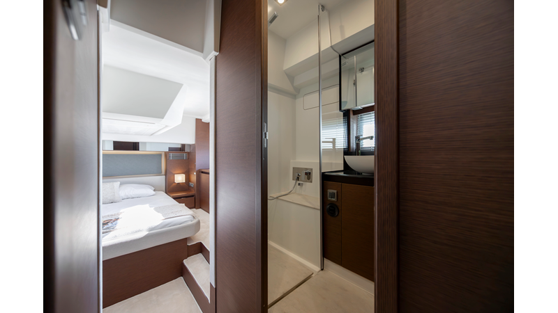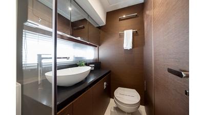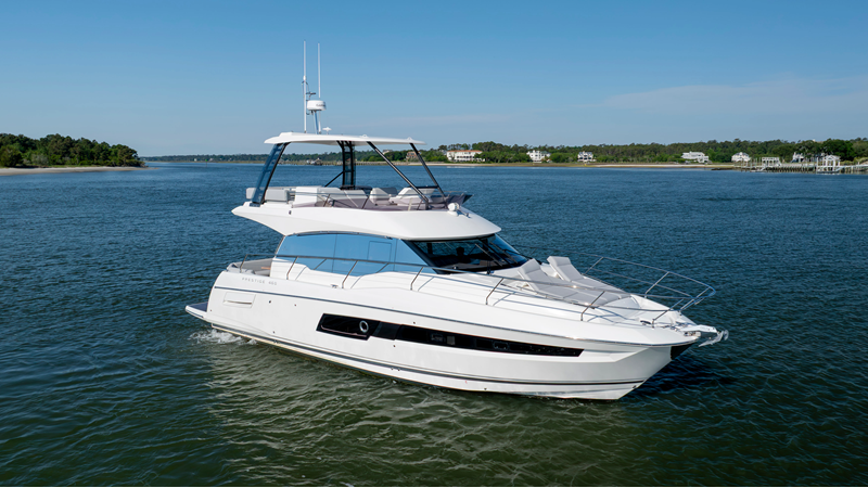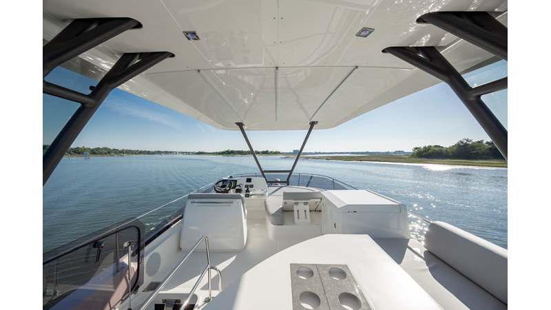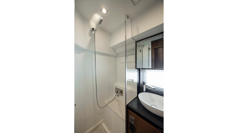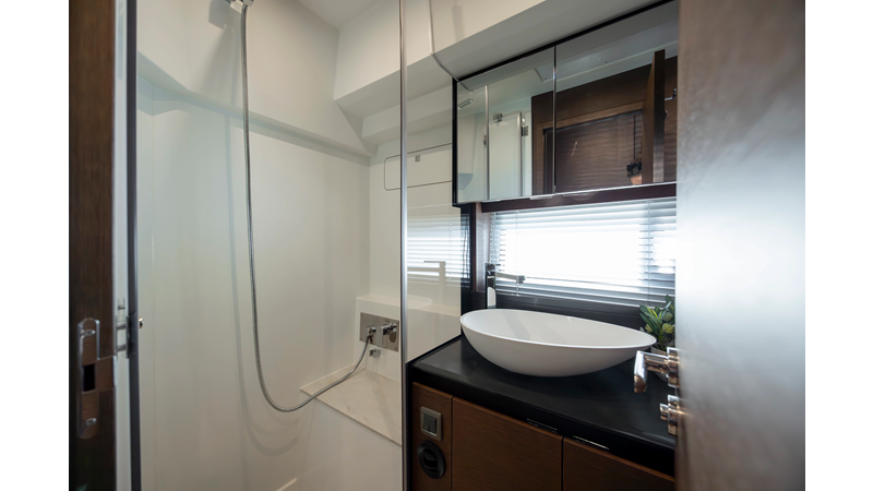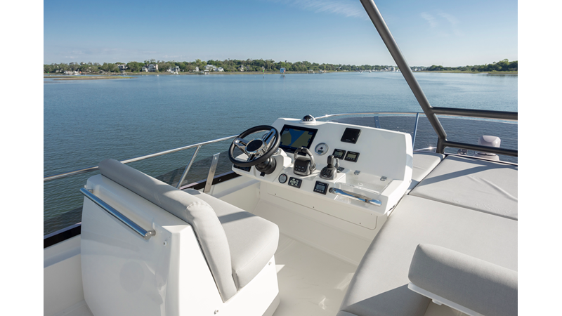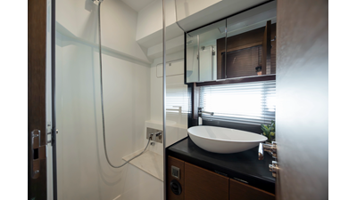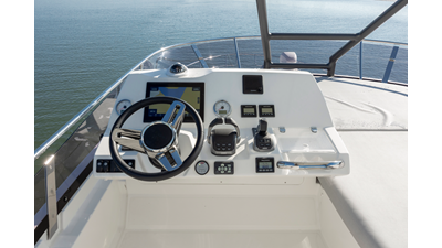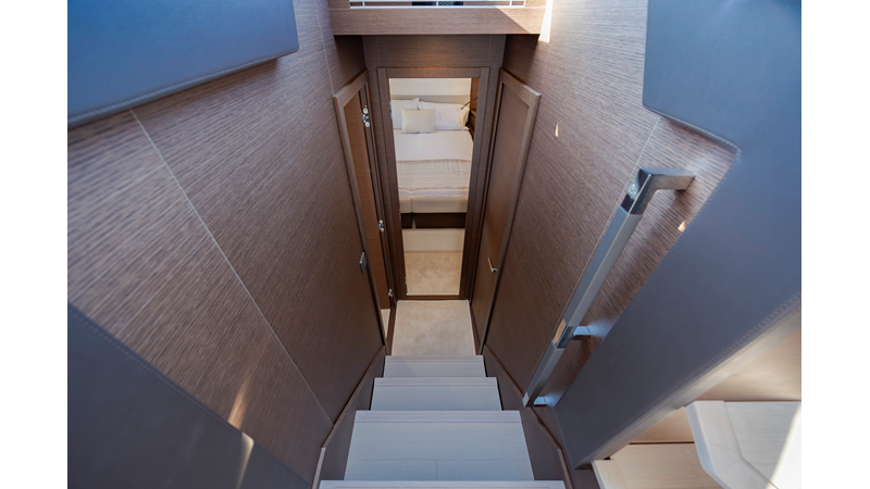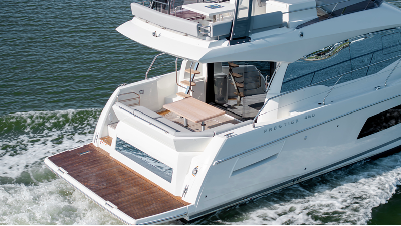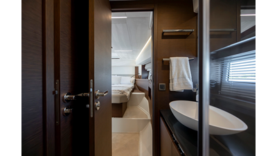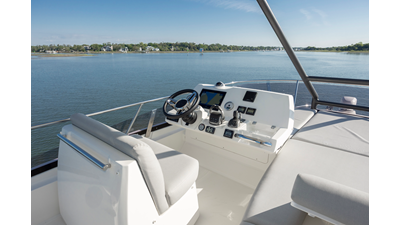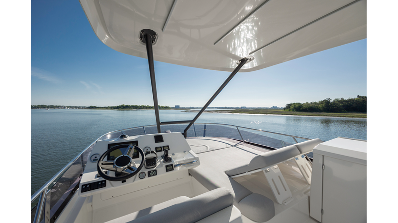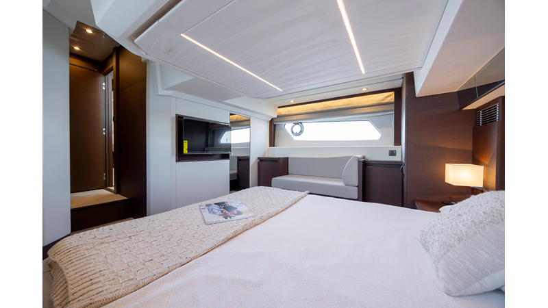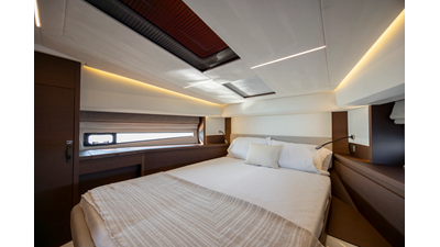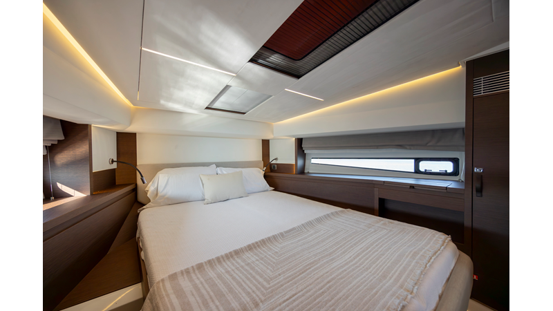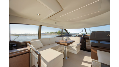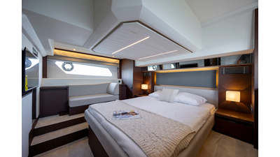 On the exterior, she features the signature style of the latest PRESTIGE Yachts, with an expanded, continuous line of windows in the hull. This Flybridge integrates the concept of the L-shaped cockpit, which allows for maximum use of space. Transformable into a very large aft sundeck, this cockpit can also house a fully equipped skipper cabin.