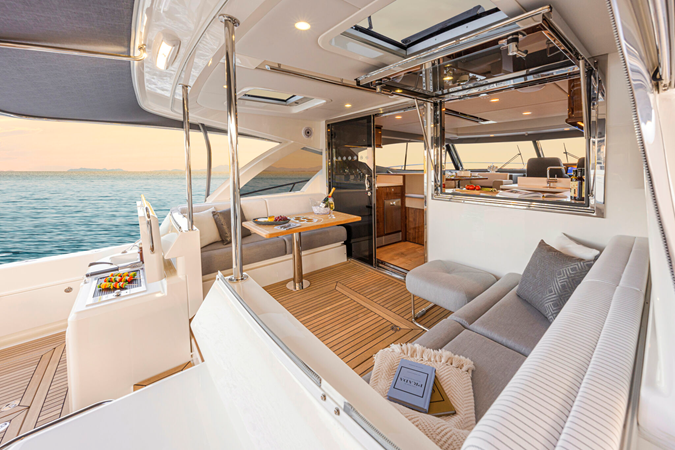 From bow to boarding platform, the 465 SUV showcases Riviera’s hallmark attention to detail, handcrafted finishes, and smart technology that makes boating effortless. The flowing salon opens seamlessly to an alfresco deck, while the expansive cockpit is always ready for water-sports action. Below deck, accommodations include three luxurious staterooms and two bathrooms, offering the liveability of a much larger yacht.