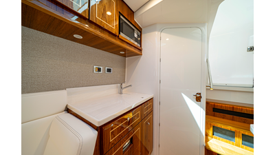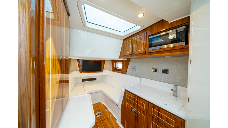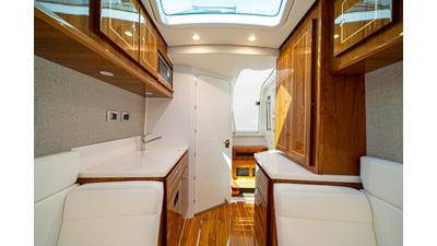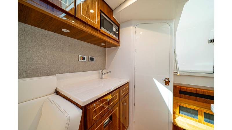 - Summer Kitchen with Corian countertop, freshwater sink, swivel faucet, tackle/gear storage, single burner electric grill, and 12V refrigerator