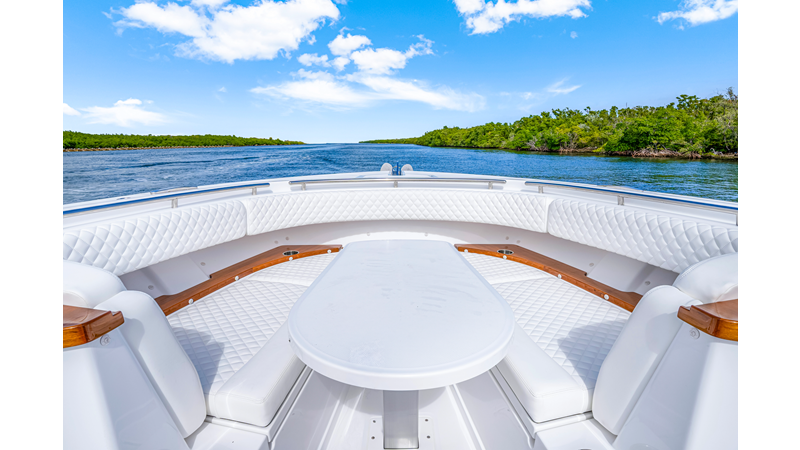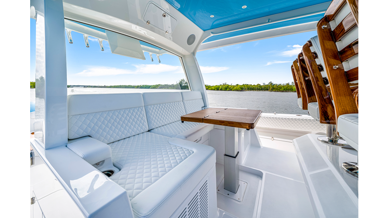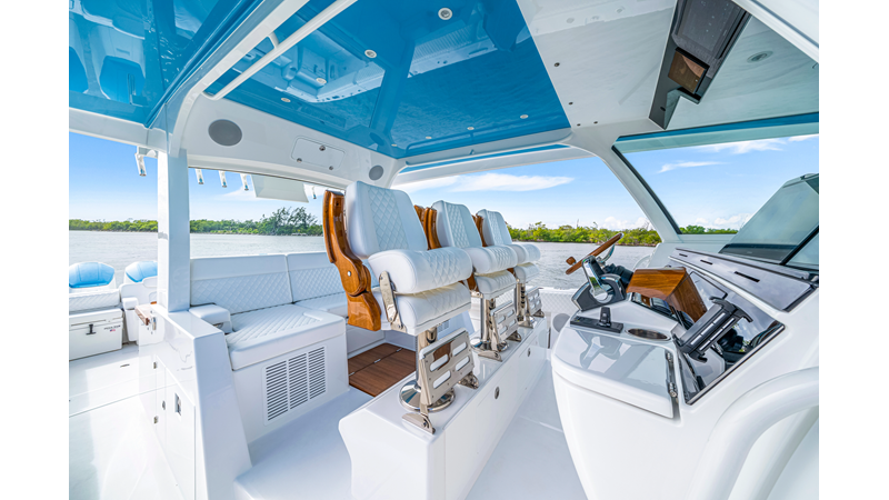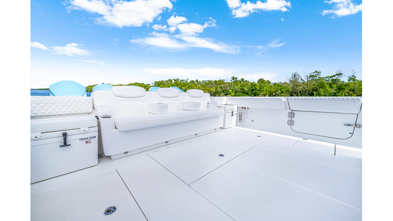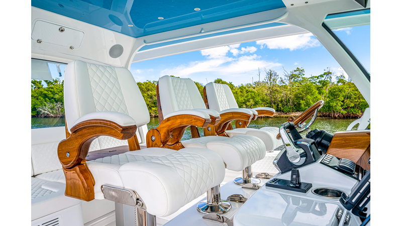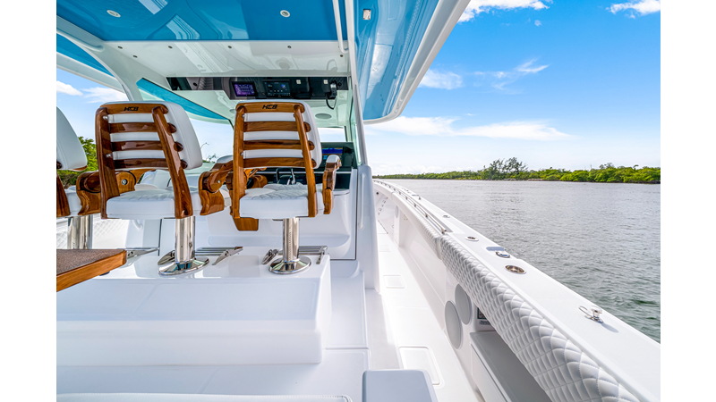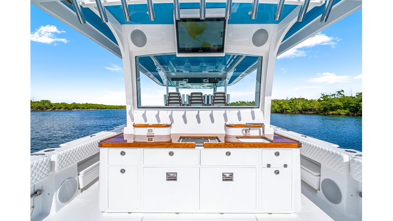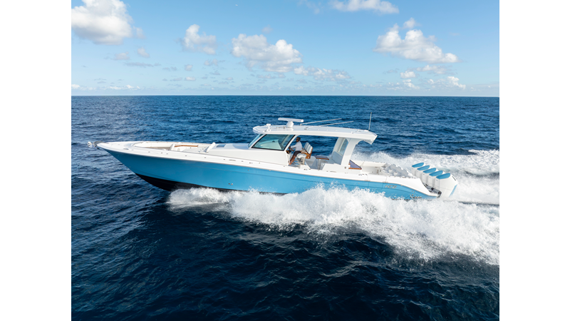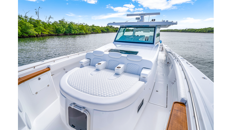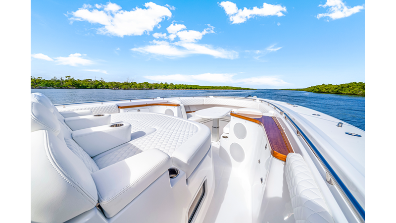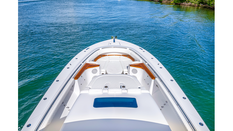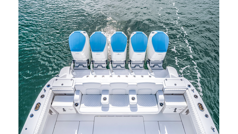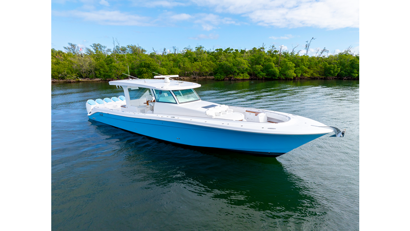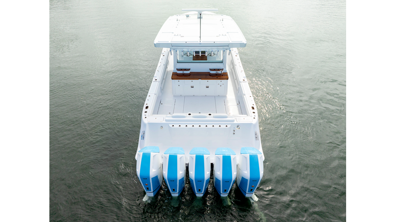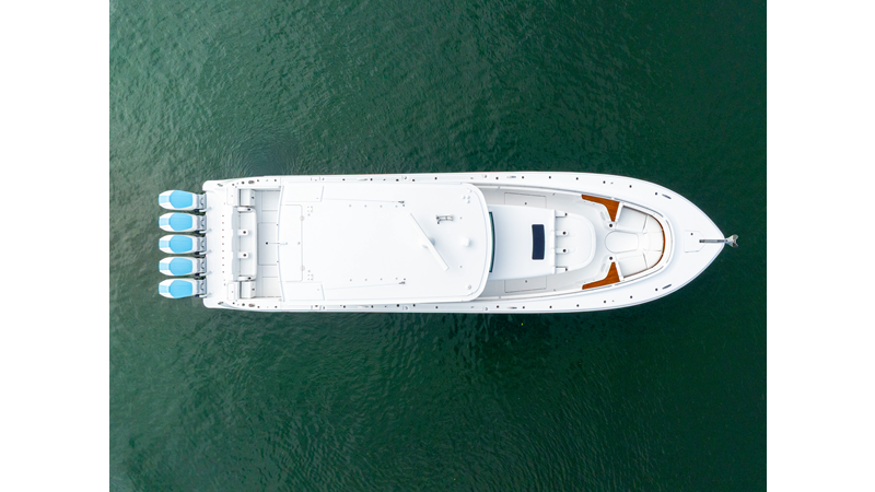 Notable Features: • Quint Mercury V12 600 HP • SeaKeeper 9 • Starlink Wi-Fi with Roku connection • Garmin 24" upgraded helm screens • Garmin aft-facing screen, AIS system, 6' radar, XM Weather • Helm A/C plus secondary cockpit A/C unit • Tempered glass aft wind blocker • Electronic aft sunshade recessed into hardtop • JL Audio Luxe flush-mount speakers • Black steering wheel with power knob • Bentley or diamond pattern premium stitching • Gem Lux outriggers and rod holder upgrade • Electric reel outlets • Downrigger weight bucket • Transom seat with dual 25-gal baitwell and molded armrests • Port and starboard 38qt transom cooler seats • Fisher Panda 15KW generator with water-separated exhaust and 55-gal diesel tank • Underwater lighting • Rainfall shower • Stainless steel rub rail accent • Loaded with additional upgrades
