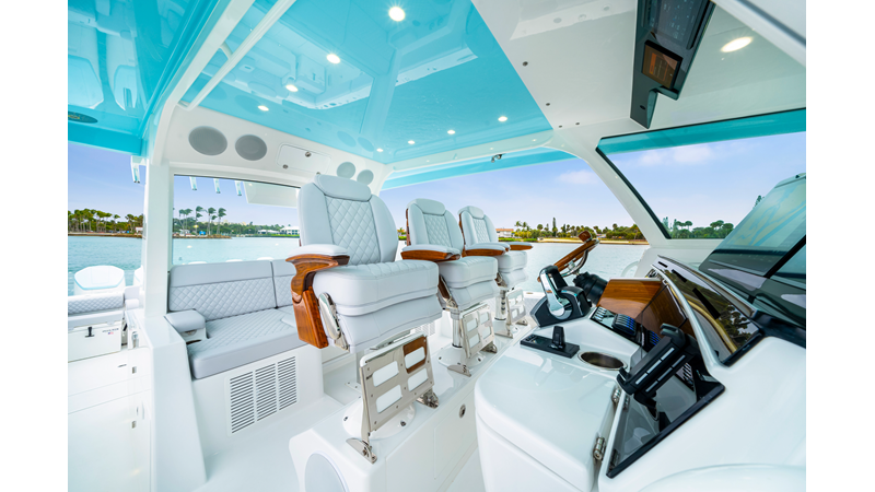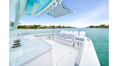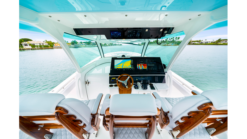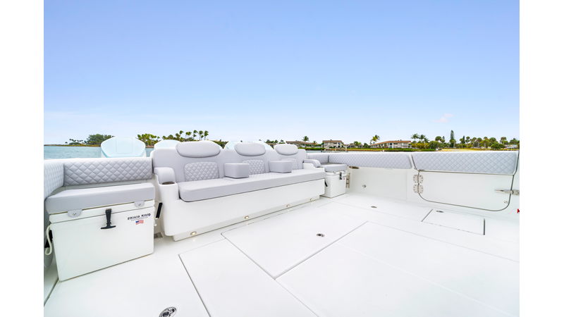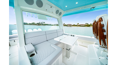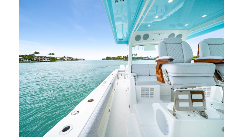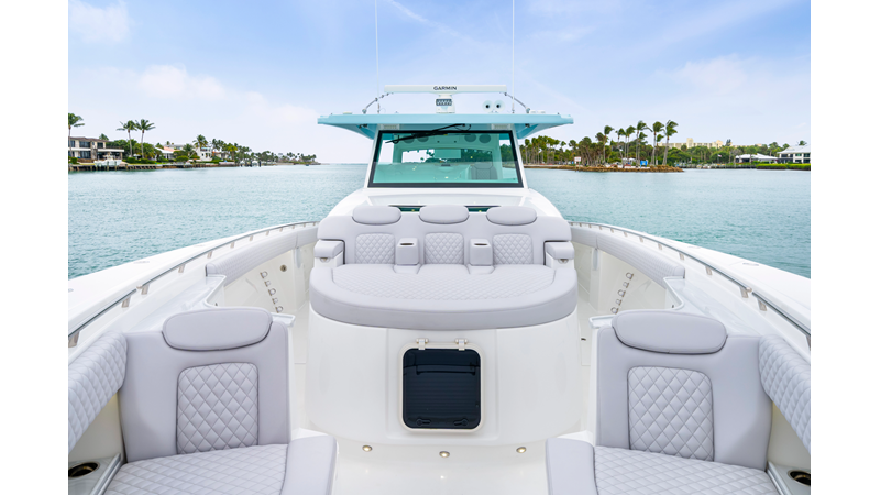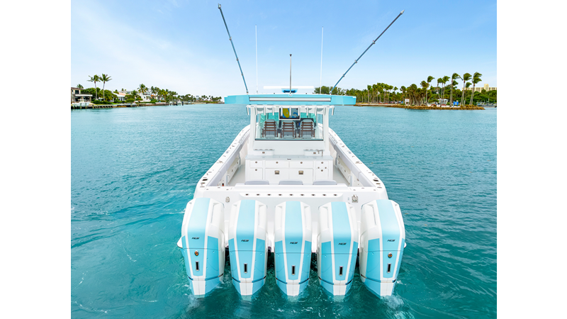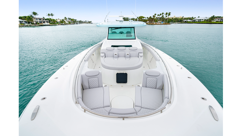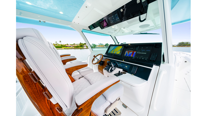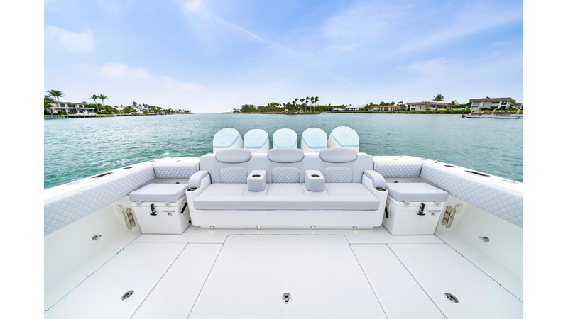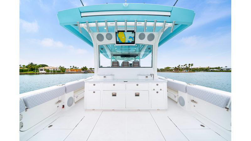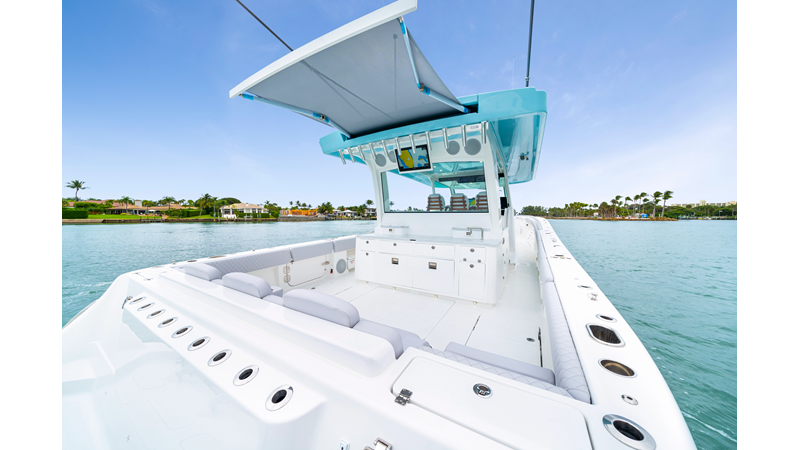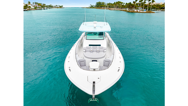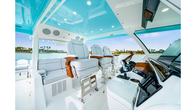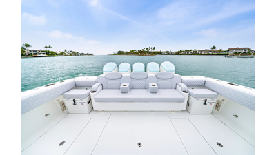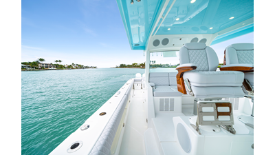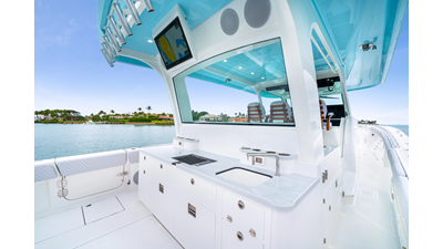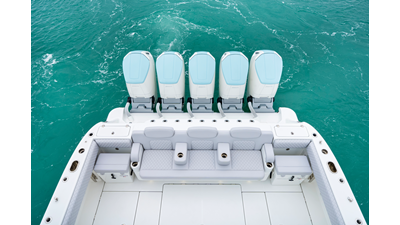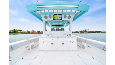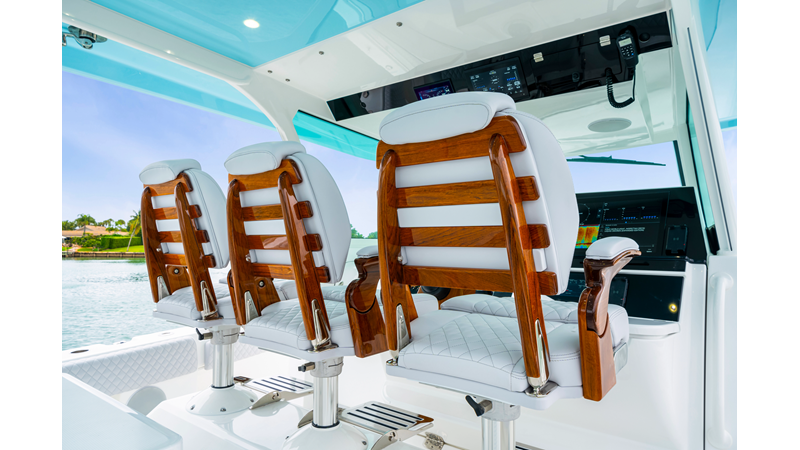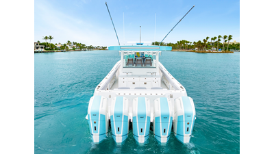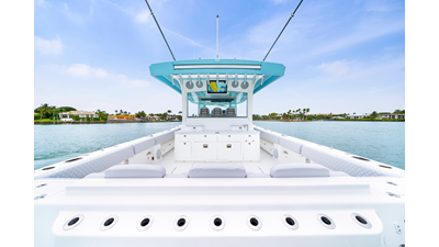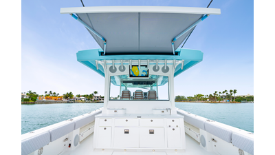 Notable Features: • Quint Mercury V12 600 HP • SeaKeeper 10 • Fisher Panda 15KW generator w/ water-separated exhaust & 55-gal diesel tank • Custom hardtop gelcoat & color-matched engine paint • Release Marine triple helm seats w/ teak ladder backs • Helm A/C plus secondary cockpit A/C unit • Tempered glass aft wind blocker • Electronic aft sunshade (recessed into hardtop) • Garmin 24" upgraded helm screens • Garmin aft-facing screen, AIS system, 6' radar, XM Weather • JL Audio Luxe flush-mount speaker upgrade • Stainless steel steering wheel w/ high-gloss teak rim & power knob • Bentley or diamond pattern premium stitching • Gem Lux outriggers & rod holder upgrade • Electric reel outlets • Transom seat w/ dual 25-gal baitwell & molded armrests • Port & starboard 38qt transom cooler seats