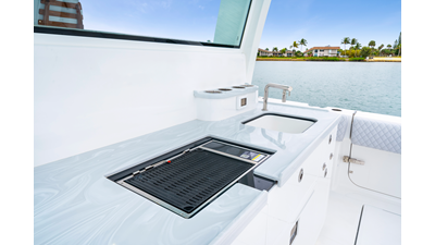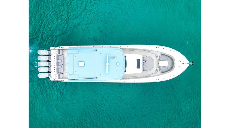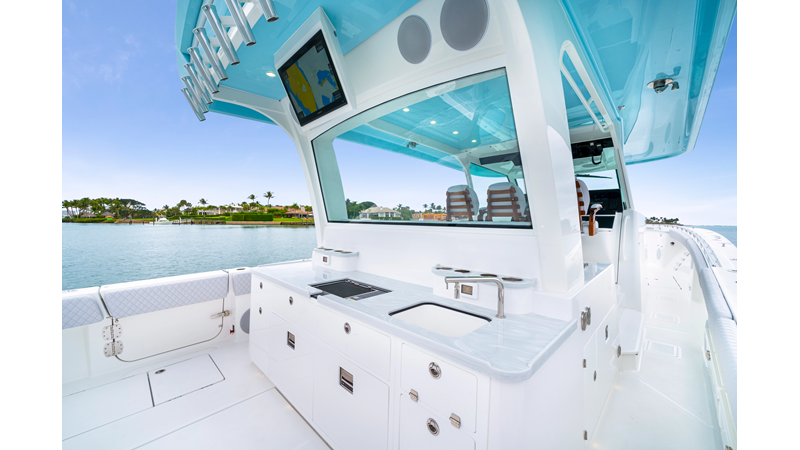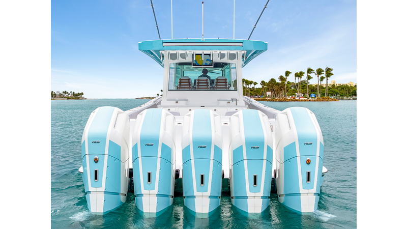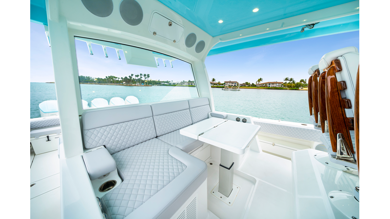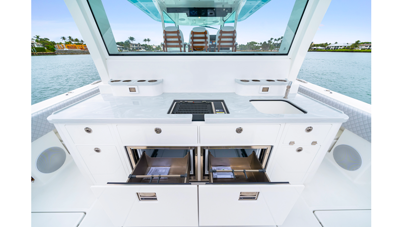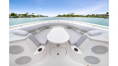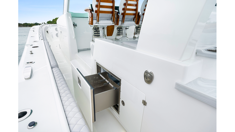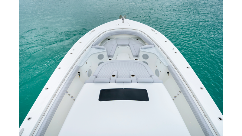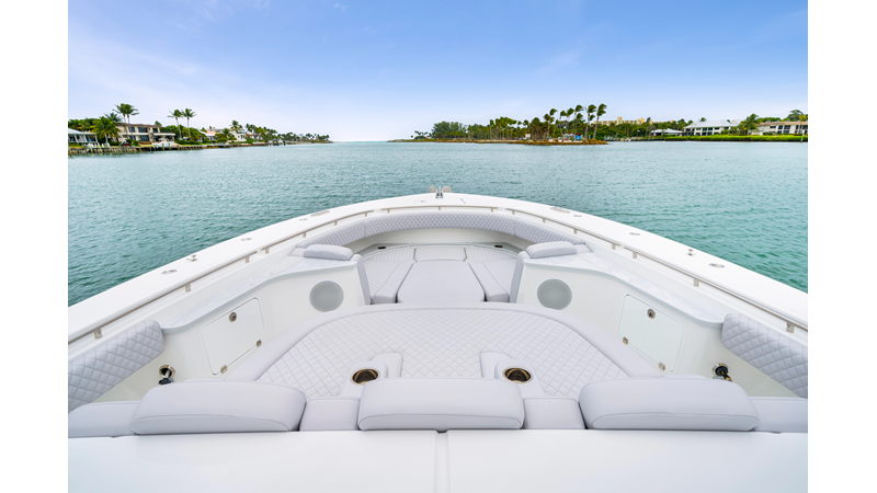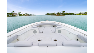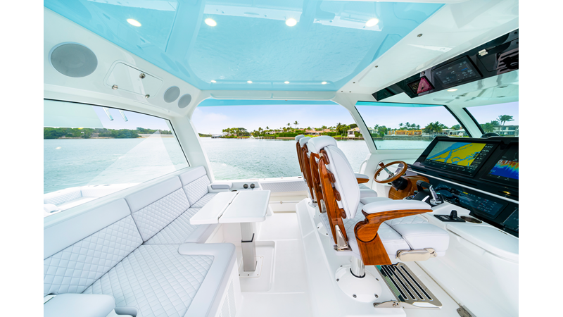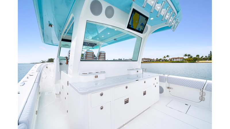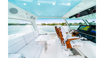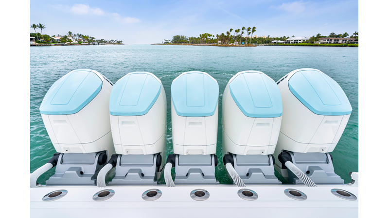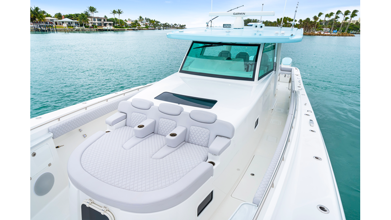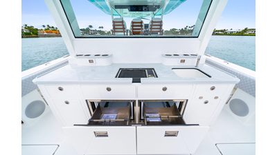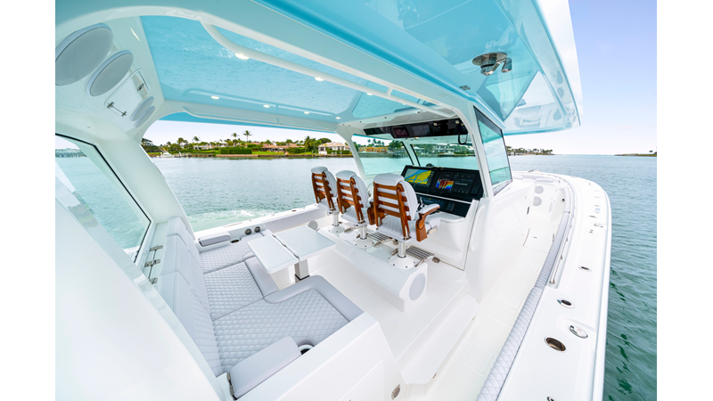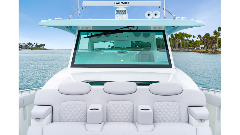 Notable Features: • Quint Mercury V12 600 HP • SeaKeeper 10 • Fisher Panda 15KW generator w/ water-separated exhaust & 55-gal diesel tank • Custom hardtop gelcoat & color-matched engine paint • Release Marine triple helm seats w/ teak ladder backs • Helm A/C plus secondary cockpit A/C unit • Tempered glass aft wind blocker • Electronic aft sunshade (recessed into hardtop) • Garmin 24" upgraded helm screens • Garmin aft-facing screen, AIS system, 6' radar, XM Weather • JL Audio Luxe flush-mount speaker upgrade • Stainless steel steering wheel w/ high-gloss teak rim & power knob • Bentley or diamond pattern premium stitching • Gem Lux outriggers & rod holder upgrade • Electric reel outlets • Transom seat w/ dual 25-gal baitwell & molded armrests • Port & starboard 38qt transom cooler seats