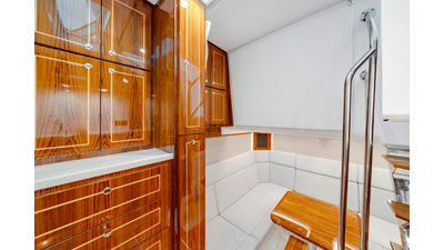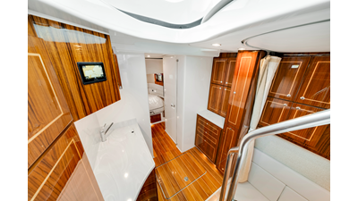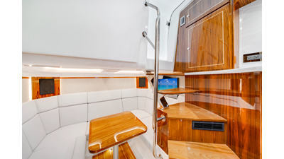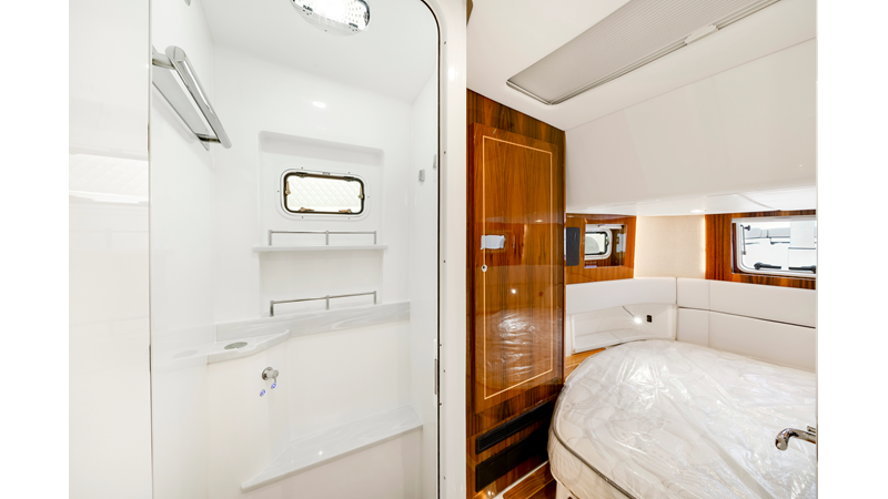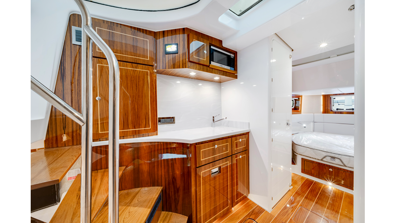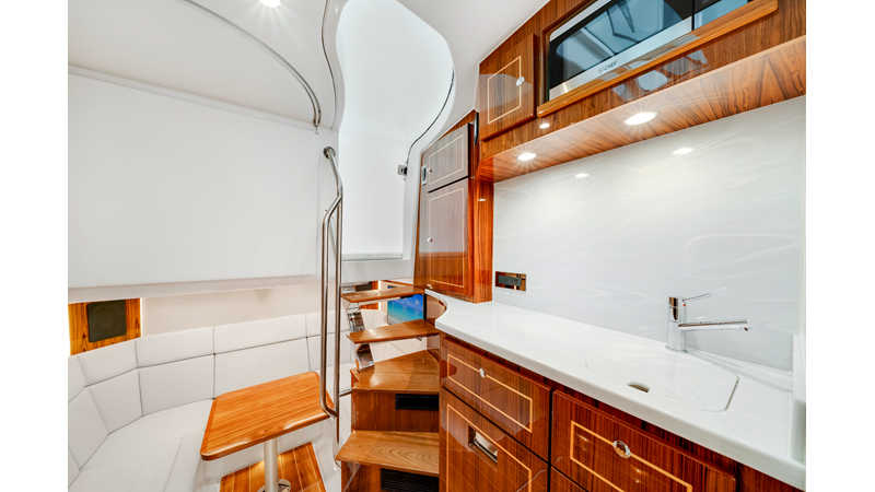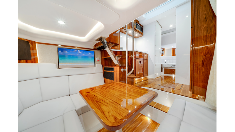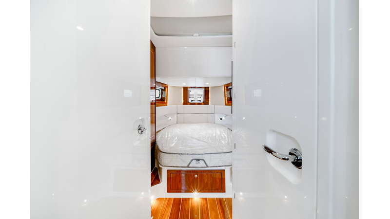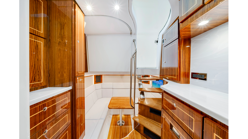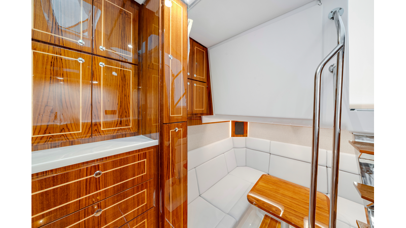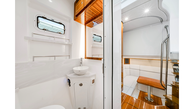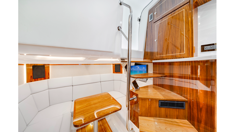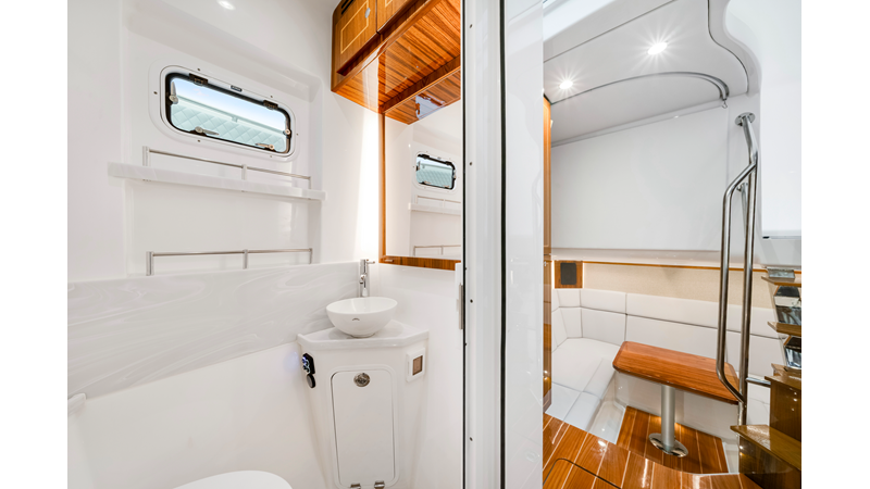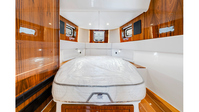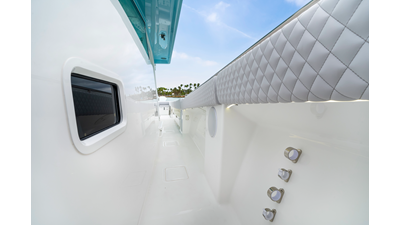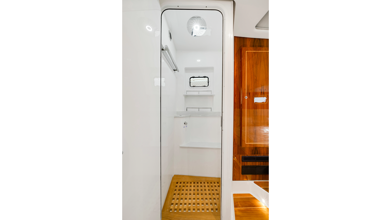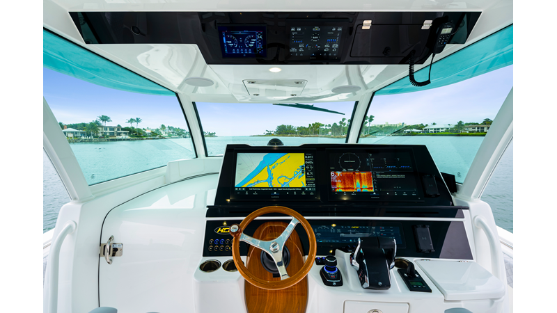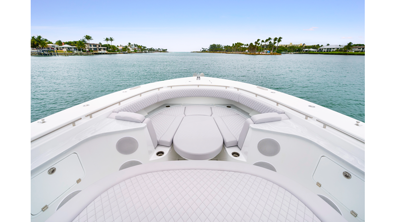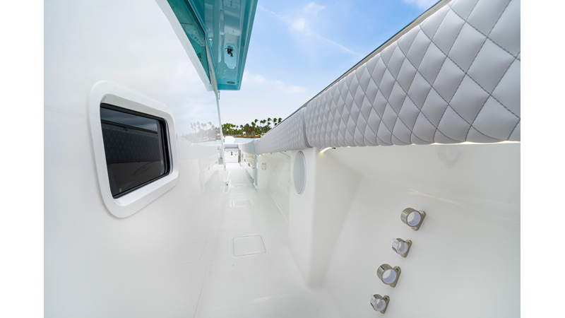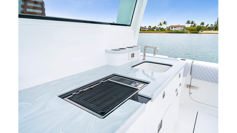Notable Features: • Quint Mercury V12 600 HP • SeaKeeper 10 • Fisher Panda 15KW generator w/ water-separated exhaust & 55-gal diesel tank • Custom hardtop gelcoat & color-matched engine paint • Release Marine triple helm seats w/ teak ladder backs • Helm A/C plus secondary cockpit A/C unit • Tempered glass aft wind blocker • Electronic aft sunshade (recessed into hardtop) • Garmin 24" upgraded helm screens • Garmin aft-facing screen, AIS system, 6' radar, XM Weather • JL Audio Luxe flush-mount speaker upgrade • Stainless steel steering wheel w/ high-gloss teak rim & power knob • Bentley or diamond pattern premium stitching • Gem Lux outriggers & rod holder upgrade • Electric reel outlets • Transom seat w/ dual 25-gal baitwell & molded armrests • Port & starboard 38qt transom cooler seats