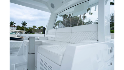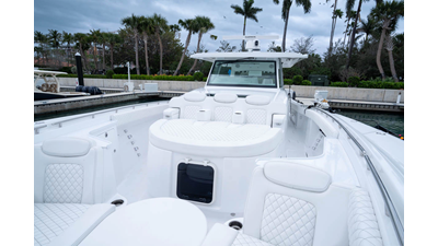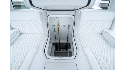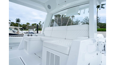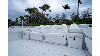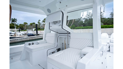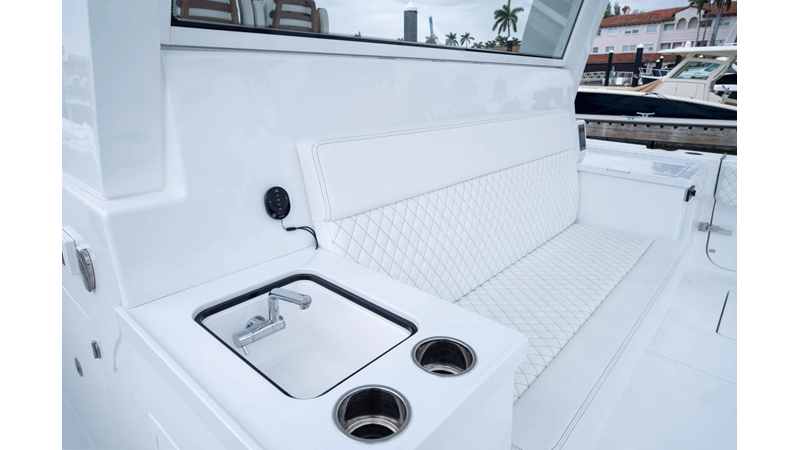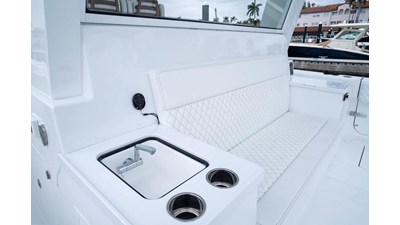 - Rear Facing Back to Back Sleigh Seating - Includes large temperature controled 115 QT Coil Wrapped Cooler, Tilt Out Tackle Storage, Counter Space with Sink with folding Faucet and 6 Cup Holders