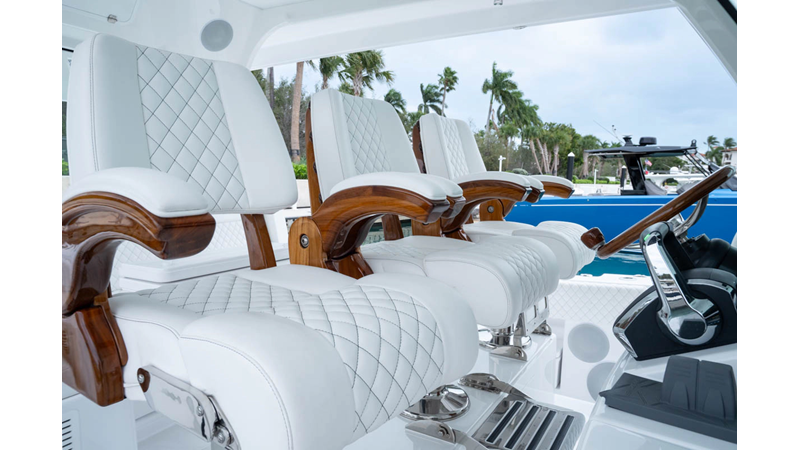 - Release Marine Triple Helm Seats with Teak Ladder Backs and Arm Rests - Includes Polished S/S Swivel Bases