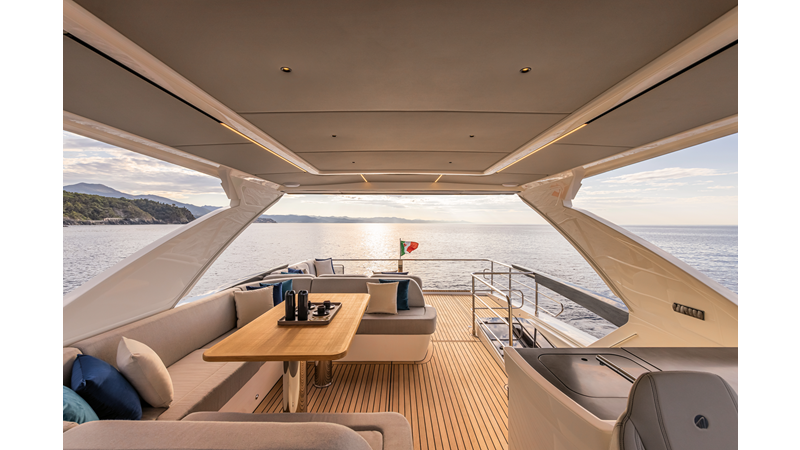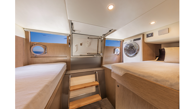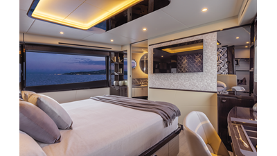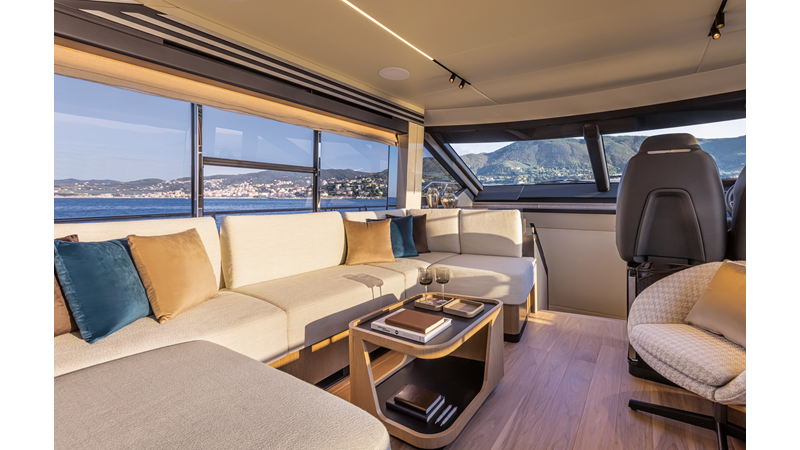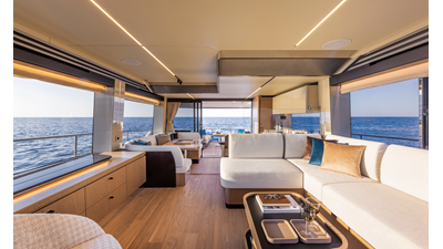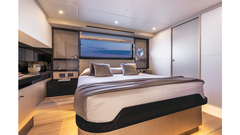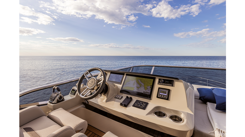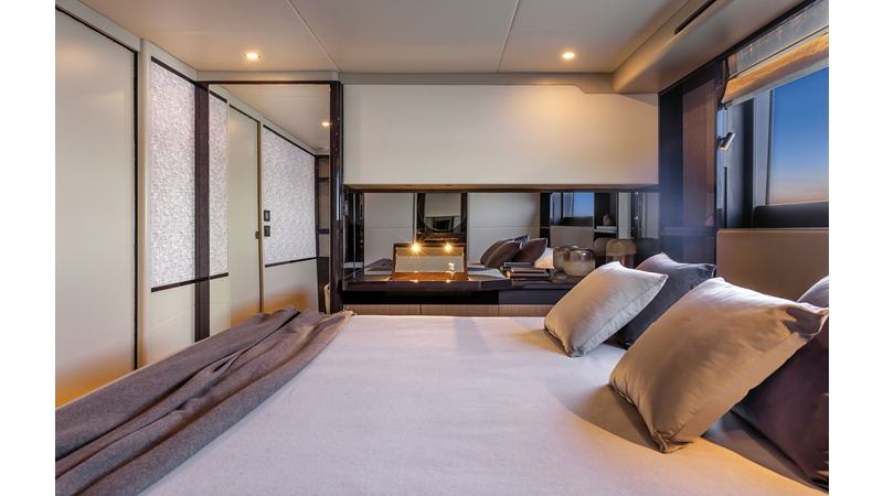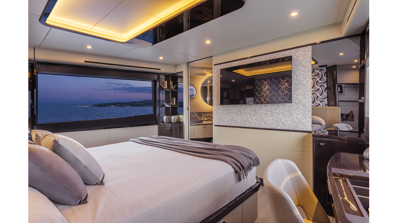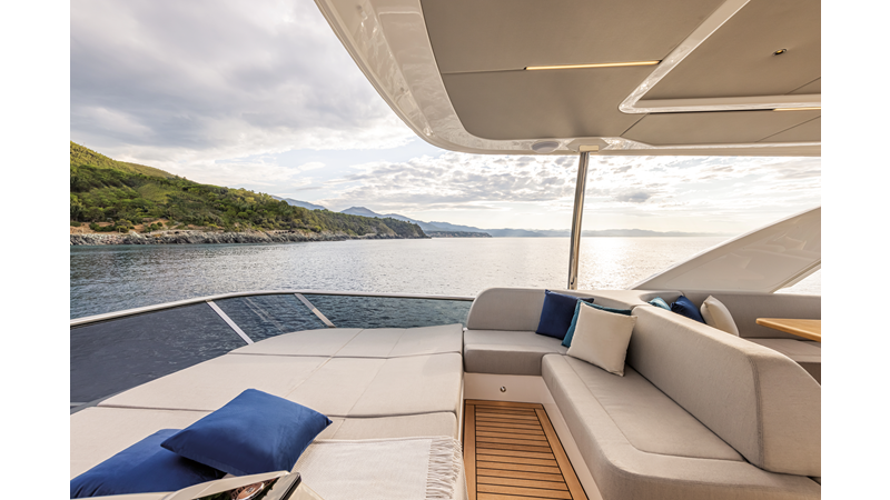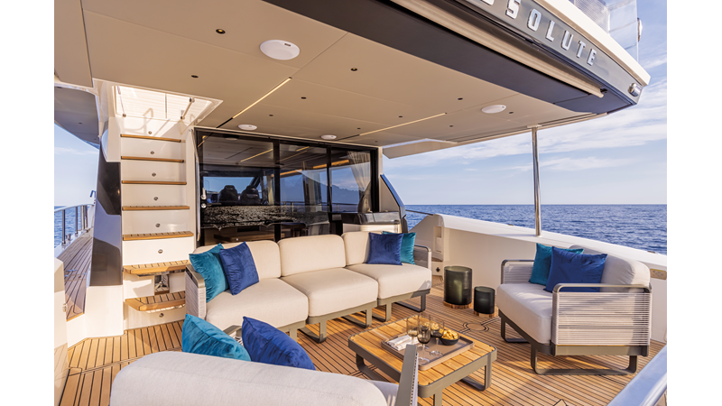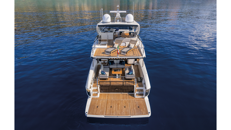 The 60 FLY, known as the Absolute Prisma, represents a new generation of flybridge yachts. With transparent glazed balustrades, large deck windows, and modular cockpit layouts, she brings a strong connection to the sea and customizable living space. Two side stairways lead to a generously sized swim platform, and a separate corridor gives crew discreet access. Below deck, the full-beam owner’s cabin forward, a VIP cabin, and a third twin cabin offer comfort without compromise. Powered by twin Volvo IPS drives, the 60 FLY balances innovation, performance, and refined design.