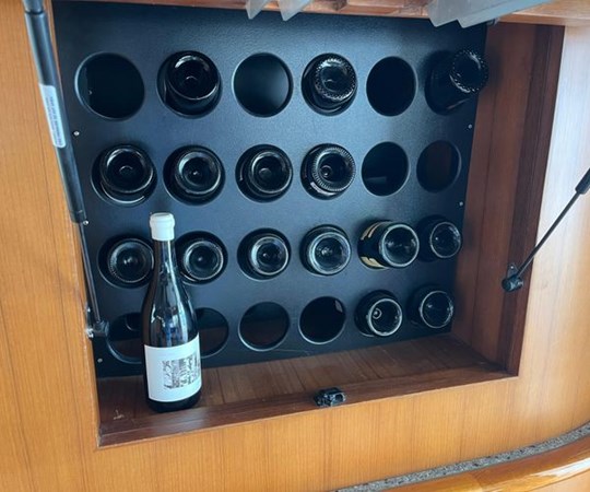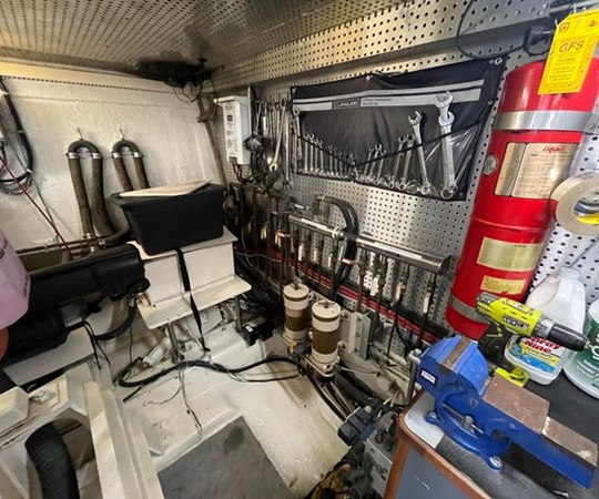 The flying bridge is enclosed in glass & features new Simrad electronics. There is also an observation tower on the hardtop