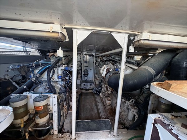 The yacht is currently land-stored and is being offered as a project vessel. It was originally equipped with twin MTU diesel engines; both engines are believed to be seized, and one has been partially disassembled with associated components included. As such, the engines will require either a complete rebuild or full replacement.