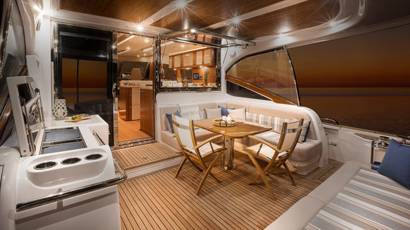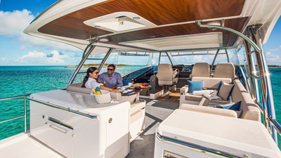 Discover the skipper’s helm forward. The lower helm and expansive helm in the Daybridge both feature state-of-the-art navigation aids, simple touchscreen operation and effortless joystick control. Volvo Penta Inboard Performance System (IPS) delivers exhilarating performance and impressive economy.