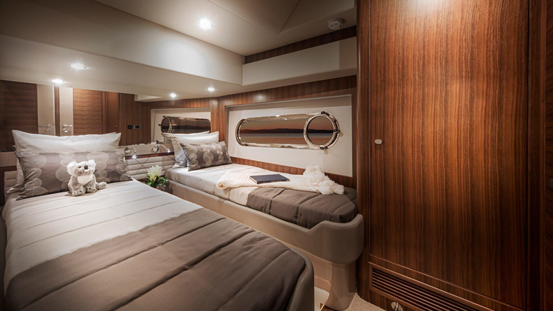 Descend the forward staircase to the accommodation deck. Choose from three or four-stateroom designs with three luxury bathrooms. Option of additional crew quarters or utility room.