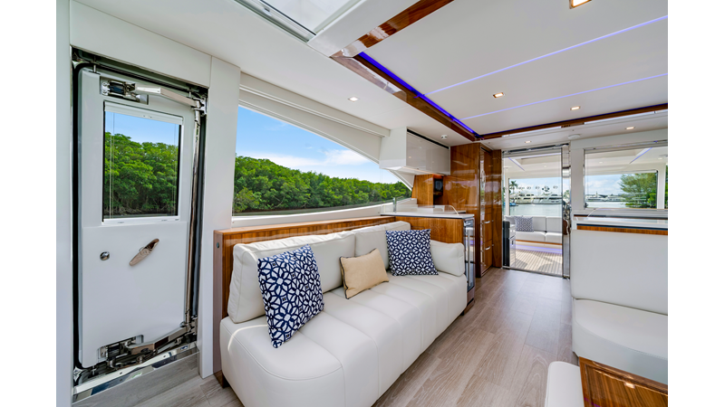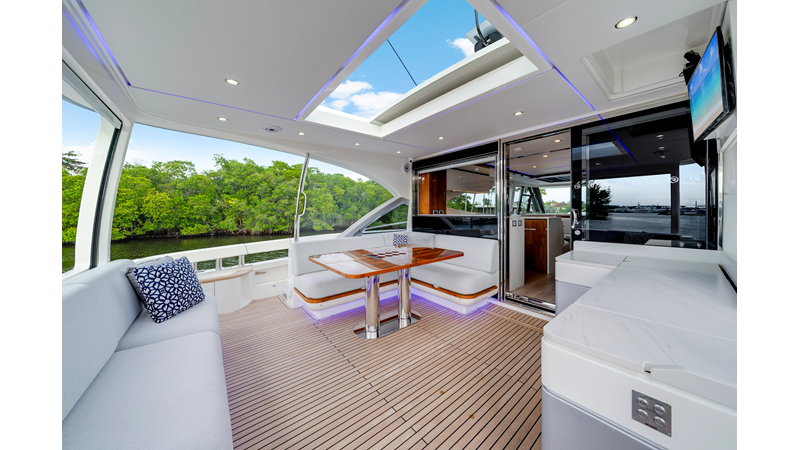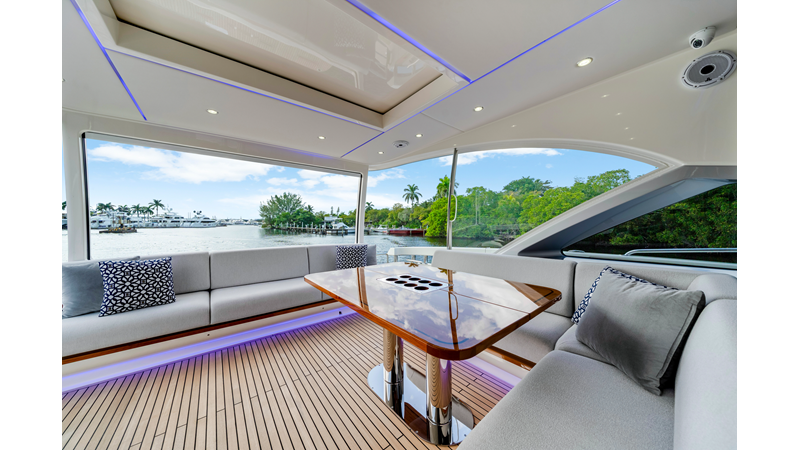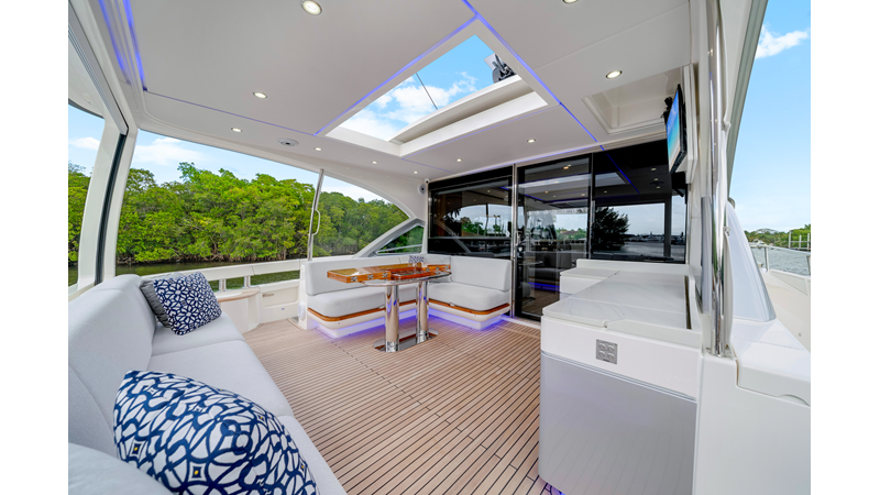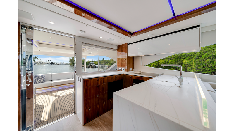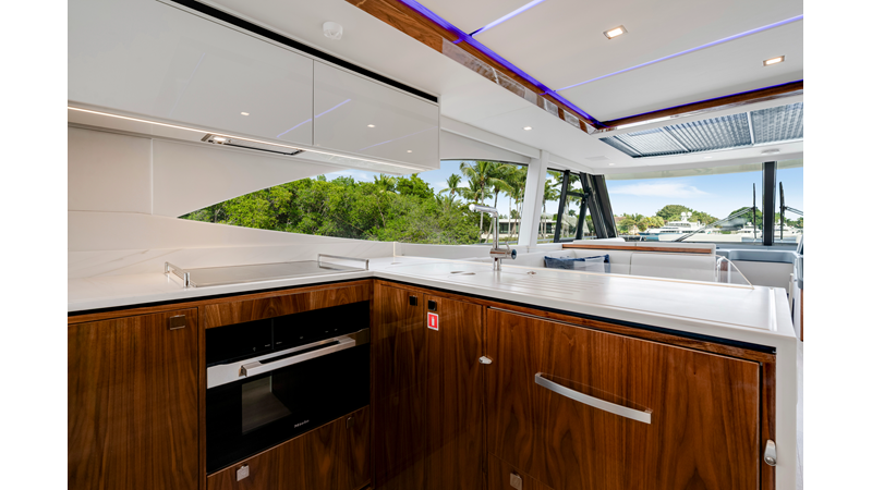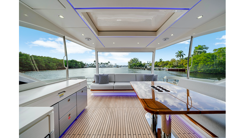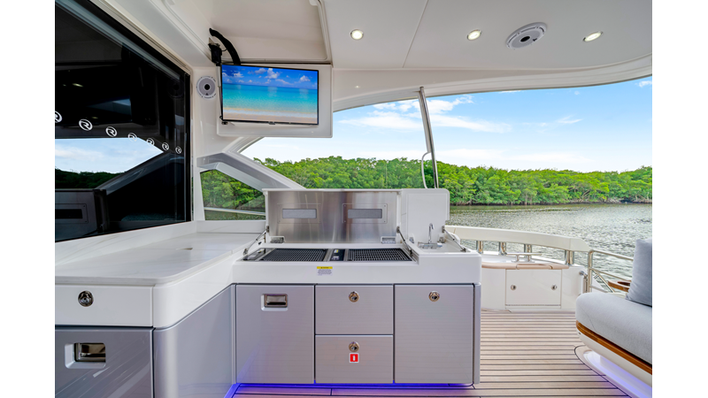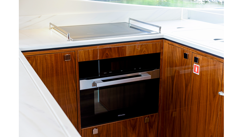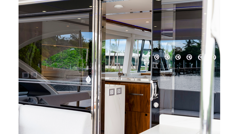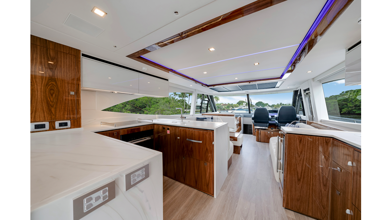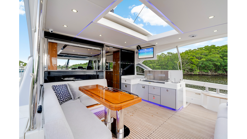 Slide open the saloon door. Then lower the electric galley window with the push of a button. Now the aft deck flows into the saloon creating one grand living and entertaining space with two designer dining areas.