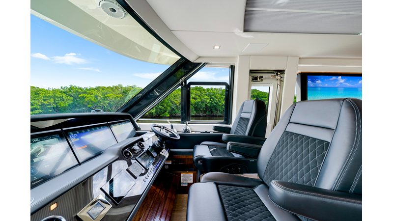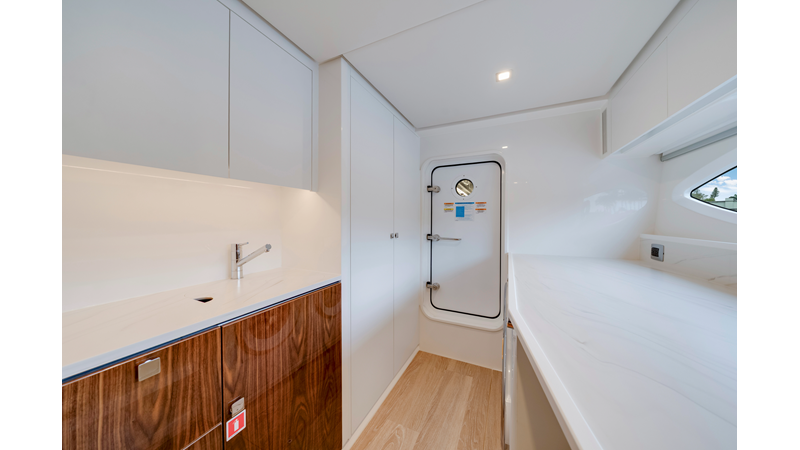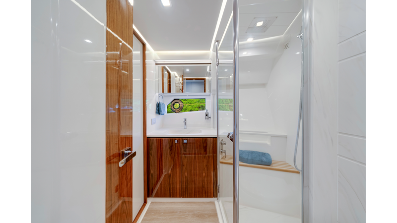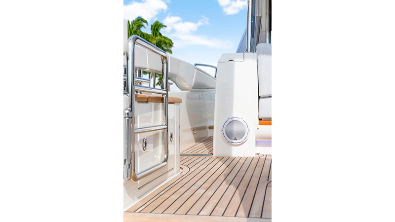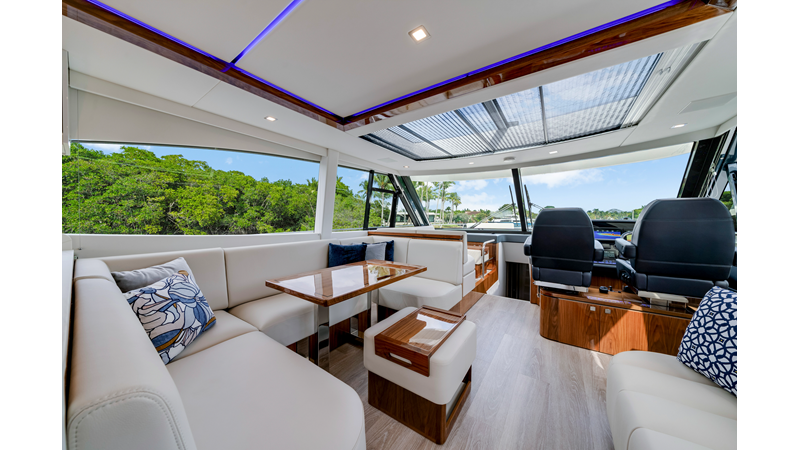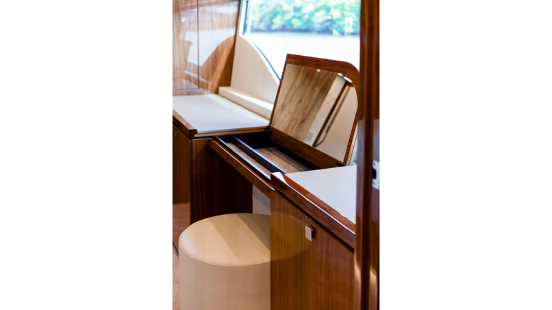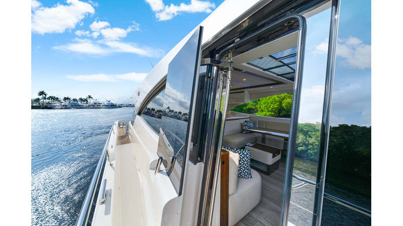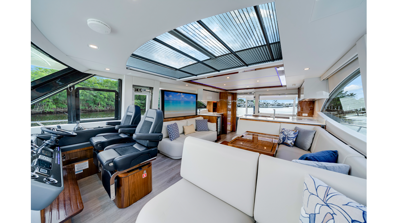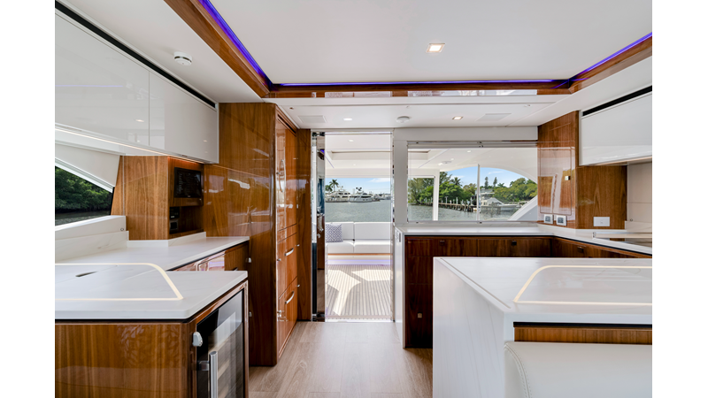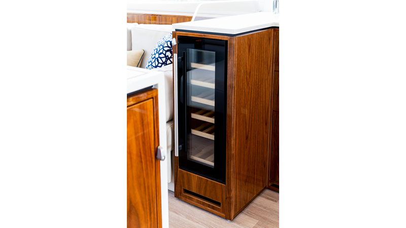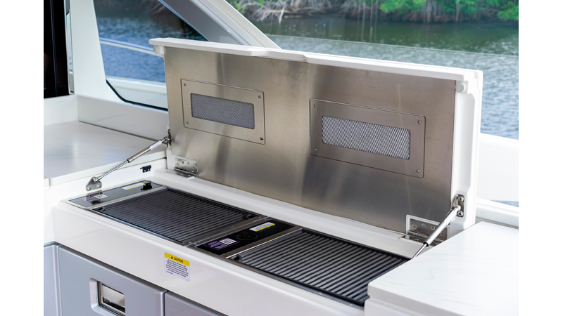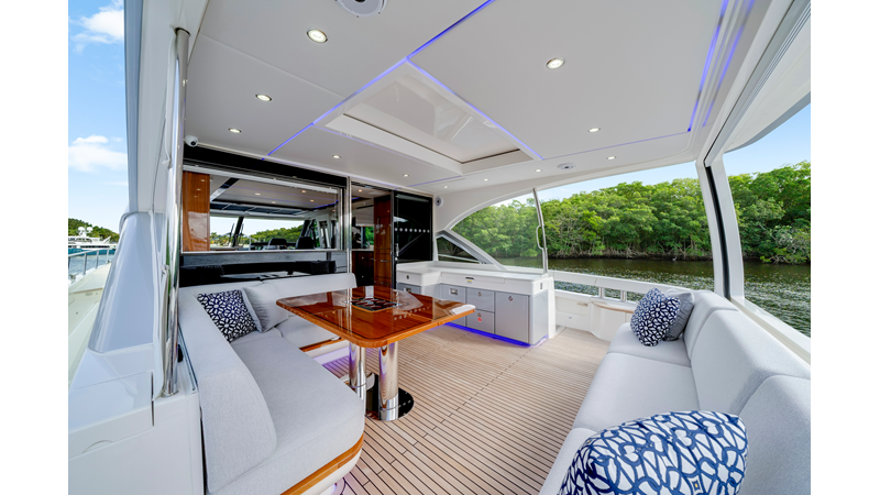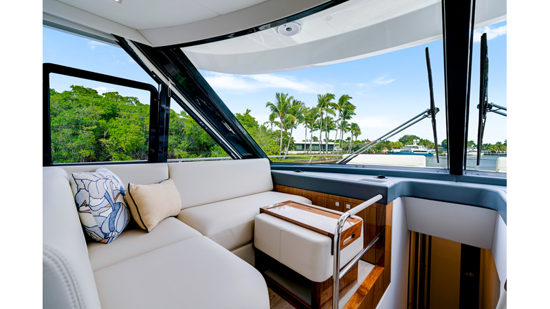 Slide open the saloon door. Then lower the electric galley window with the push of a button. Now the aft deck flows into the saloon creating one grand living and entertaining space with two designer dining areas.