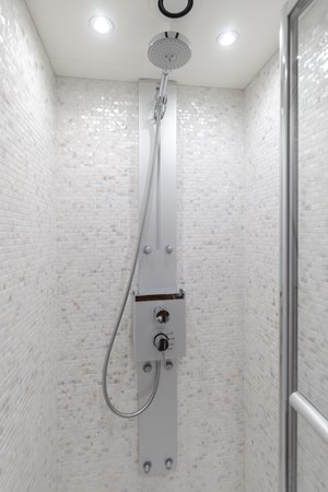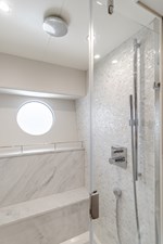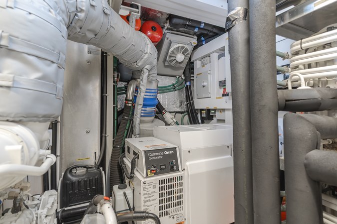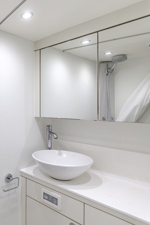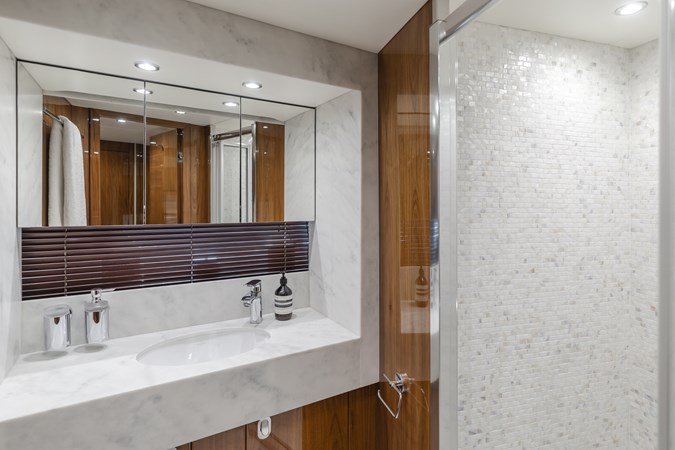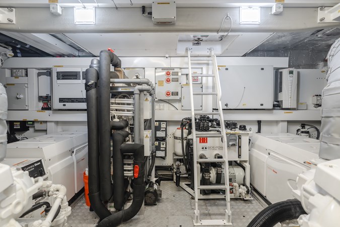 Her open-plan interior with high-gloss wood finishes and pristine white furnishings, creating an airy, elegant atmosphere. The main salon flows effortlessly into a formal dining area, with an adjacent galley ensuring seamless crew service, ideal for entertaining. Zero-speed fin stabilizers guarantee a smooth ride, whether cruising or at anchor.