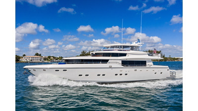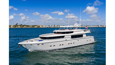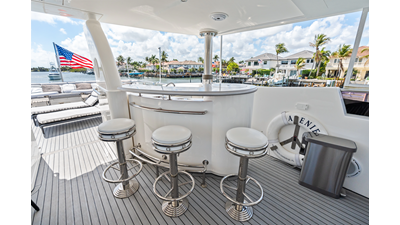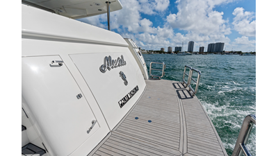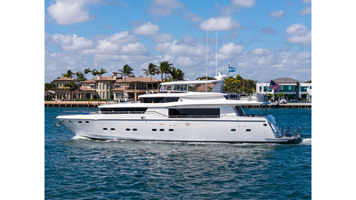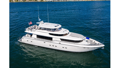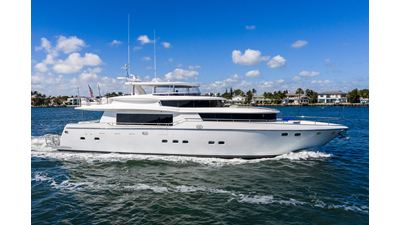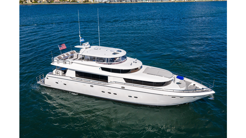 The unmistakable lines of the Bill Dixon design, with upper and lower vertical windows, make her profile iconic. This same yacht is still being built today, now marketed as a 93 with an extended platform.
