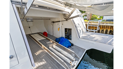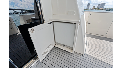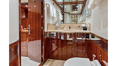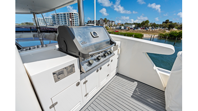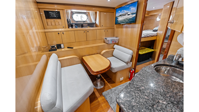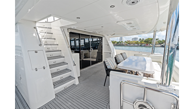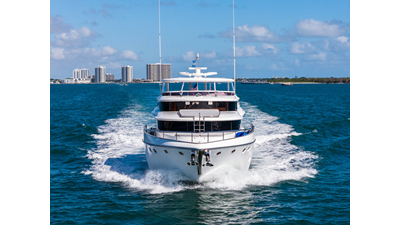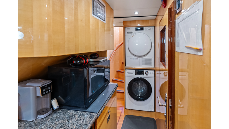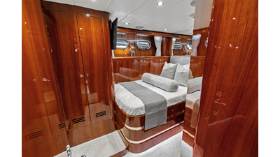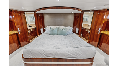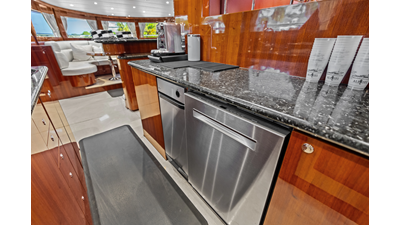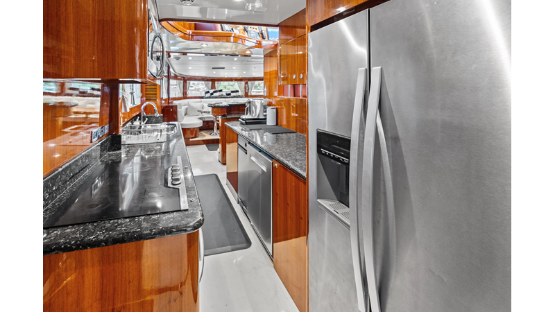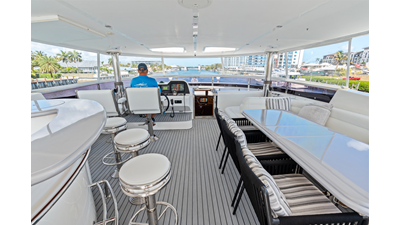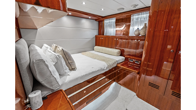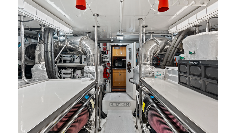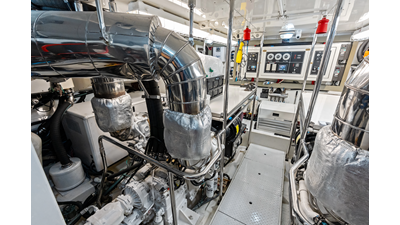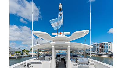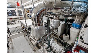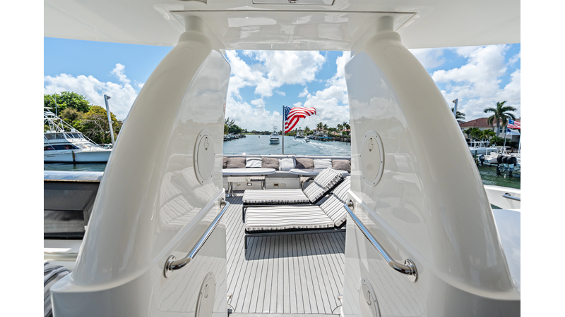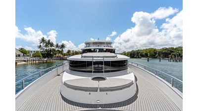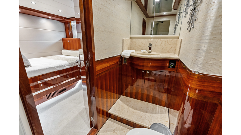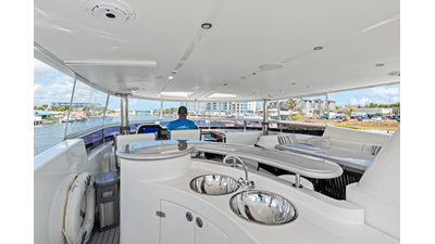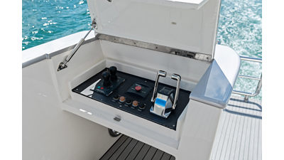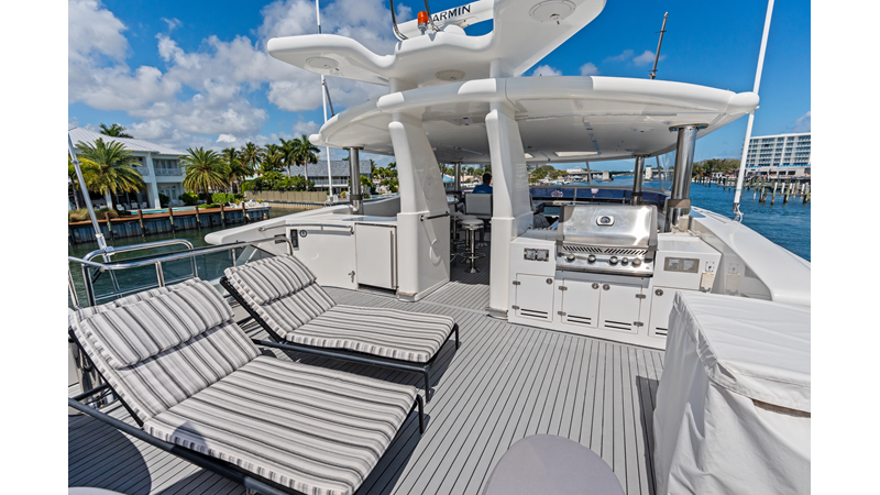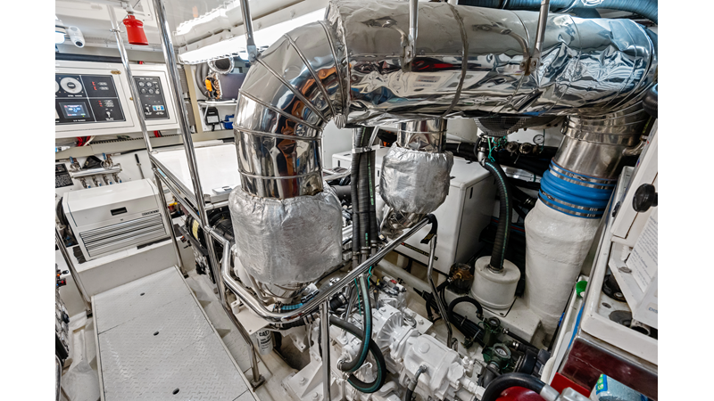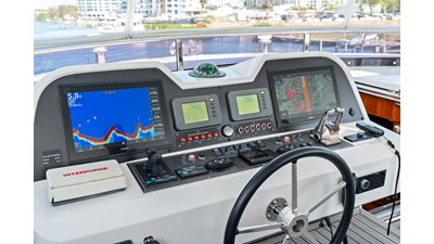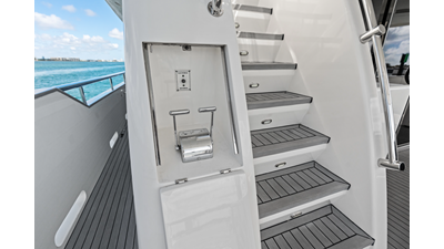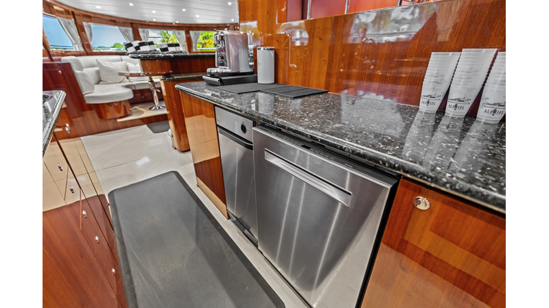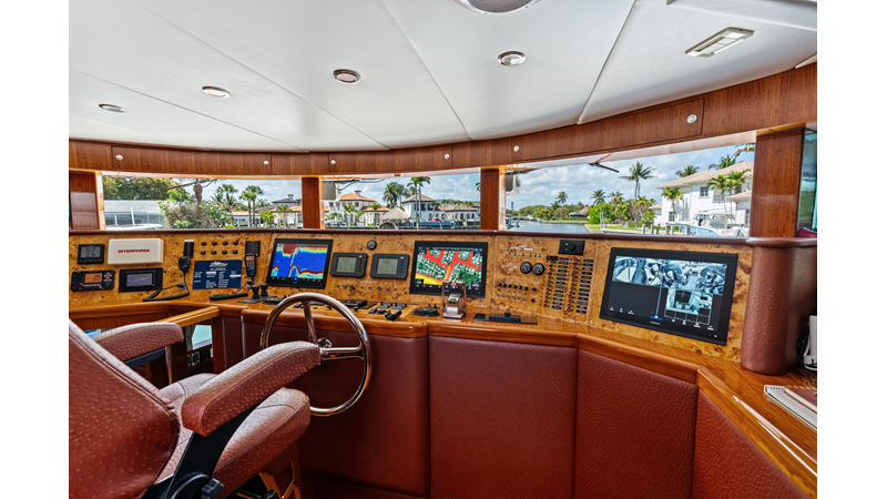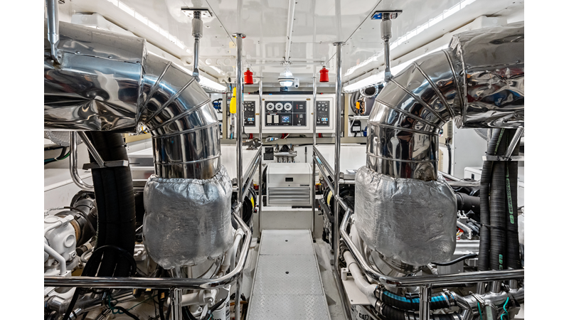 This is especially evident in the spacious salon and country kitchen with atrium, while still offering large walk-around side decks and four separate boarding areas. She is equipped with ABT Trac fins for stabilization, hydraulic bow and stern thrusters, and Dockmate wireless control, allowing navigation from anywhere onboard. Additionally, there are two auxiliary steering stations (port and starboard) on the aft main deck, as well as controls on the flybridge and raised pilothouse (RPH).