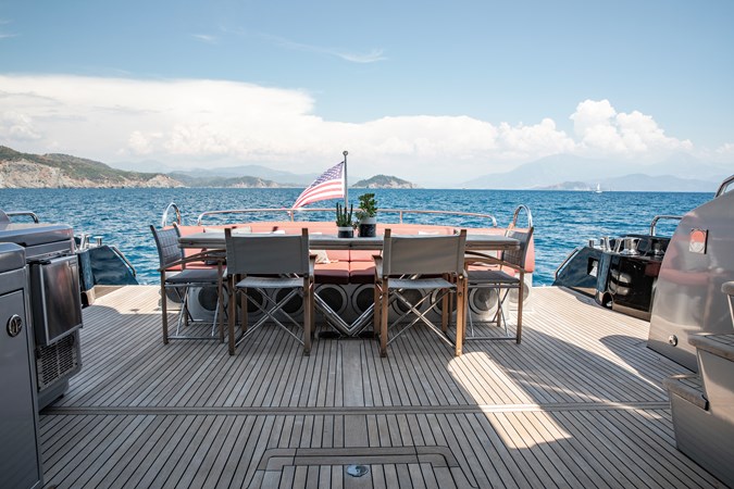 Sitting beneath the vast sliding hardtop roof is the main saloon and cockpit. When opened, natural light illuminates the interior allowing guests to indulge in the lavish surroundings.