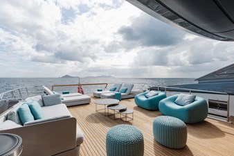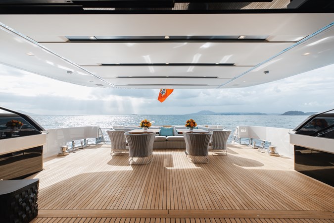 Stepping aboard from the aft, the yacht immediately introduces a sense of ease and openness. The teak-laid cockpit is generous without feeling oversized, arranged as a true outdoor living space rather than a formal stern terrace. It is a place designed for slow mornings, long lunches, and evenings that naturally extend toward the water. Wide access leads seamlessly down to the beach club and tender garage, reinforcing the yacht’s lifestyle-driven character. This is not a token swim platform, but a proper waterside hub—where tenders, toys, and the sea itself become part of daily life. Everything here feels intentional, practical, and designed for owners who genuinely use their yacht rather than simply display it.