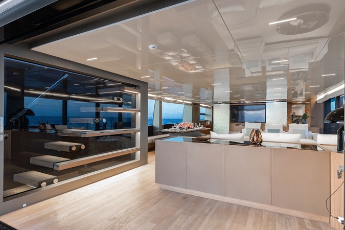 The dining area, positioned to port, maintains a degree of intimacy while remaining visually connected to the rest of the main deck. It comfortably accommodates guests without ever feeling isolated, reinforcing the idea of shared spaces that still allow moments of privacy. The relationship between interior and exterior is seamless here, reflecting a design philosophy focused on openness, movement, and livability rather than compartmentalization.