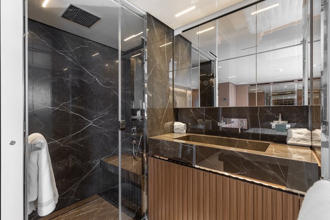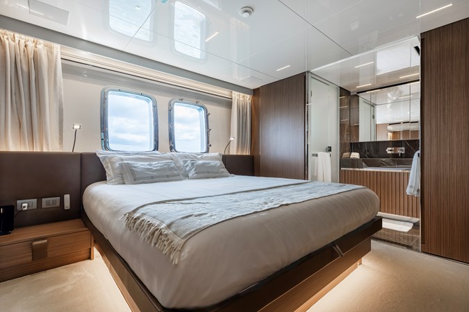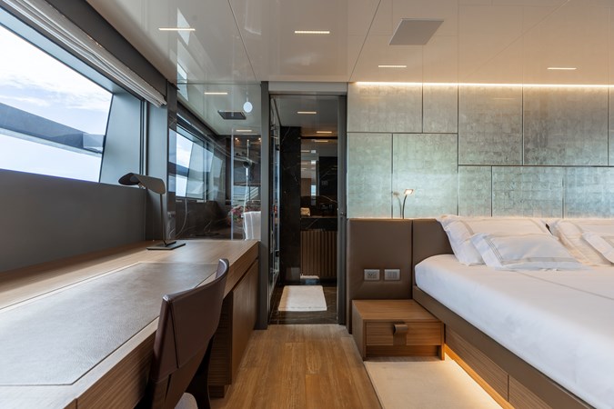 Forward on the main deck, the full-beam Owner’s suite stands apart as a true private retreat. Shielded from guest and crew circulation, it offers a level of privacy rarely achieved on yachts of this size. The space is bright and calm, with expansive windows framing the view outside and filling the room with natural light. A king-size berth, seating area, generous wardrobe space, and a beautifully finished ensuite combine to create an environment that feels more like a personal apartment than a yacht cabin. Direct access forward adds another layer of independence, allowing the owner to move through the yacht on their own terms.