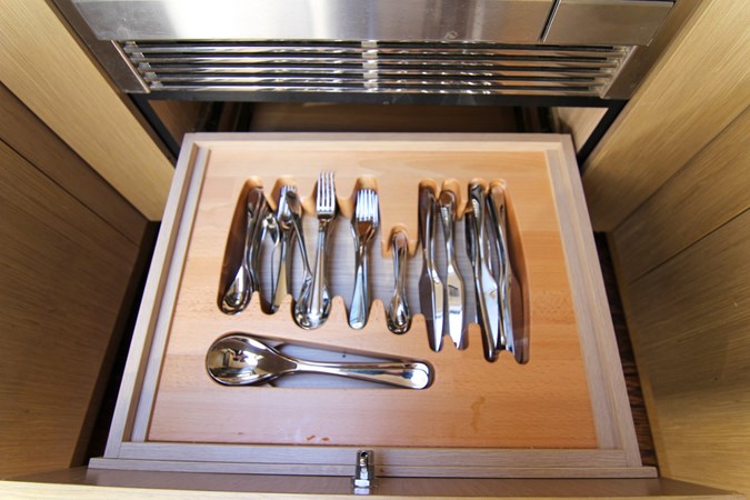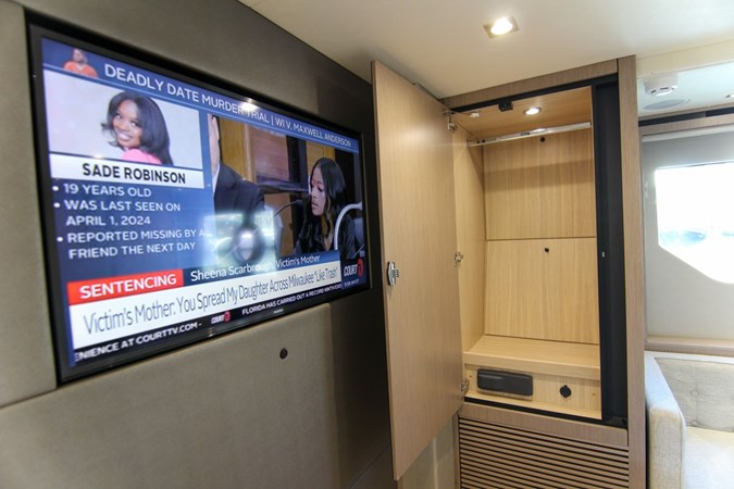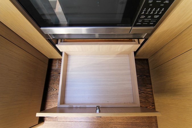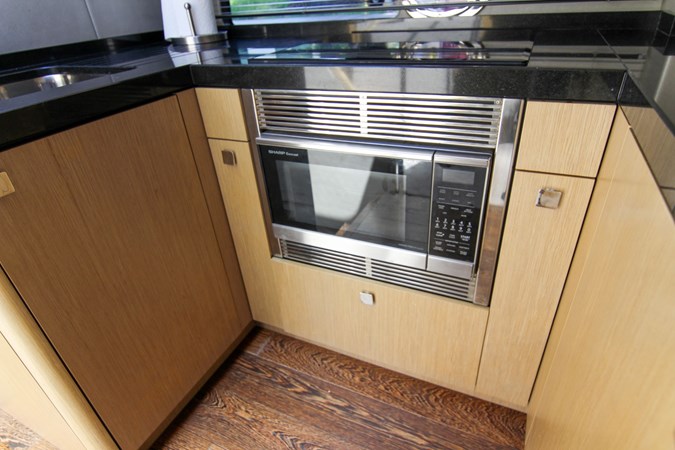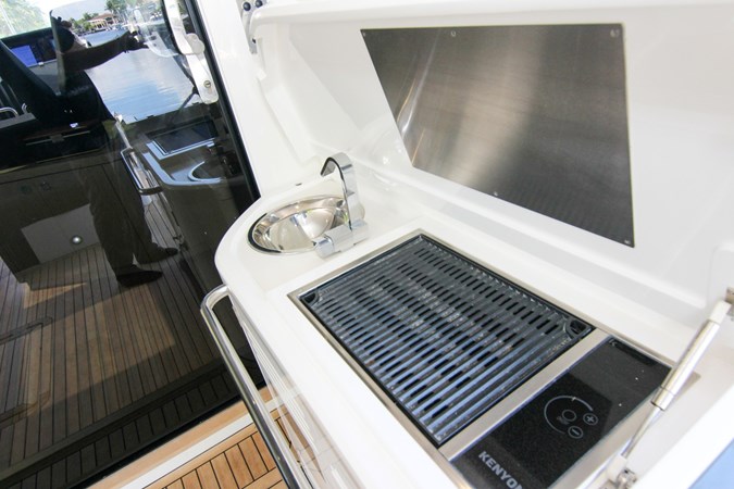 Convenient Amenities: A fully equipped wet bar with grill, sink, and refrigeration, alongside a tender garage, ensures your time on board is both relaxing and convenient.