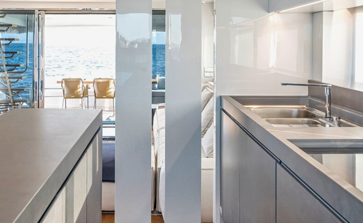 She accommodates eight guests across four cabins, including a full-beam midships master, a VIP cabin forward, and two additional guest cabins, all with en suite bathrooms. Separate crew accommodation provides space for up to four crew members if required.
