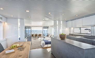 Outdoor areas include a cockpit dining space and a large flybridge with sunbeds, generous seating, and an additional helm station. Bow and stern thrusters, twin generators, and a hydraulic swim platform further enhance the yacht’s practicality.