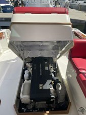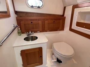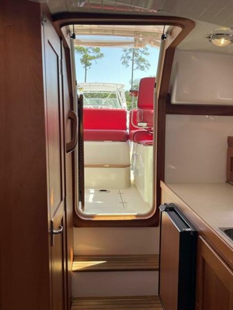 Her express hardtop with stainless steel supports, teak accents, and spacious cockpit create an inviting space for entertaining, day cruising, or even light fishing. Below, the beautifully finished interior features custom cherry joinery, Corian countertops, a well-equipped galley, enclosed head with shower, and a convertible V-berth—making overnight stays comfortable and stylish.