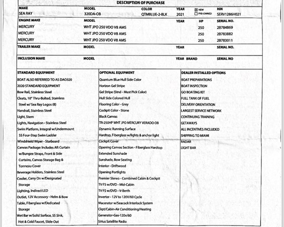 STANDARD EQUIPMENT BOAT ALSO REFERRED TO AS DAO320 2020 STANDARD EQUIPMENT Bow Rail, Stainless Steel Cleats, 10* Thru-Bolted, Stainless Steel w/ Sea Ray Logos (8) Handrail, Stainless Steel Light, Stern Lights, Navigation - Stainless Steel Swim Platform, Integral w/Undermount SS Four-Step Swim Ladder Windshield Wiper - Starboard Canvas Package: Includes Aft Curtain w/Bungee Straps, Front & Side Curtains, Canvas Storage Bag & Tonneau Cover Beverage Holders, Stainless Steel Cooler, Carry On w/Designated Storage Lighting, Indirect LED Outlet, 12V Accessory - Helm & Bow Table, Fiberglass w/Dedicated Storage Wet Bar w/Solid Surface, SS Sink, OPTIONAL EQUIPMENT Quantum Blue Hull Side Color Horizon Gel Stripe Gel Stripe (Stnd - Must Pick Color) Hull Side Colored Hull Flooring Color - Grey Cockpit Color - Stone Black Canvas TR-250HP WHT JPO MERCURY VERADO OB Dynamic Running Surface Hardtop, Fiberglass w/lights & anchor light Cockpit Cover Opening Canvas Section - Fiberglass Hardtop Extended Sunshade Sunshade, Bow Seating Interior - Driftwood Opening Portlights Premier Stereo - Combined Cabin & Cockpit TV FS w/DVD - Mid-Cabin TV FS w/DVD - V-Berth Inverter - 12V to 120V/60 Cycle Macerator w/Seacock Interlock System Ckpt/Cabin-Air Conditioning/Heating Generator-Gas-120v/60 Radar Light bar