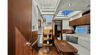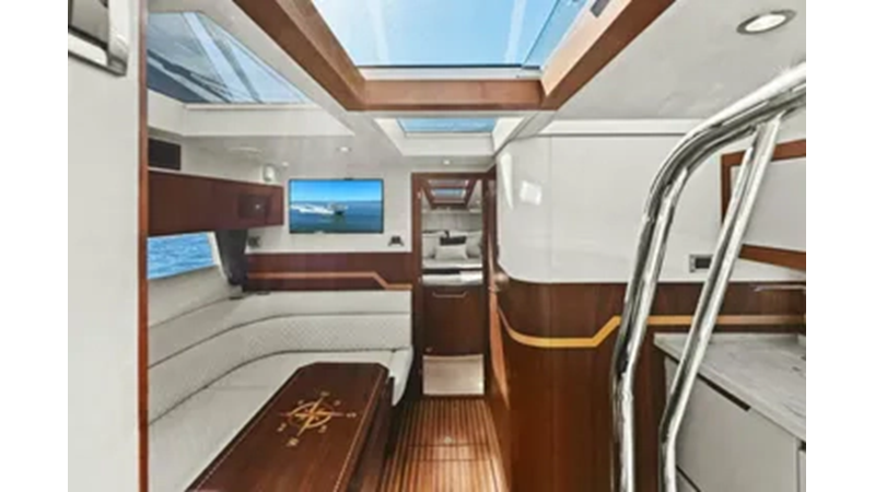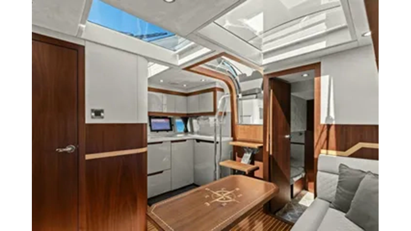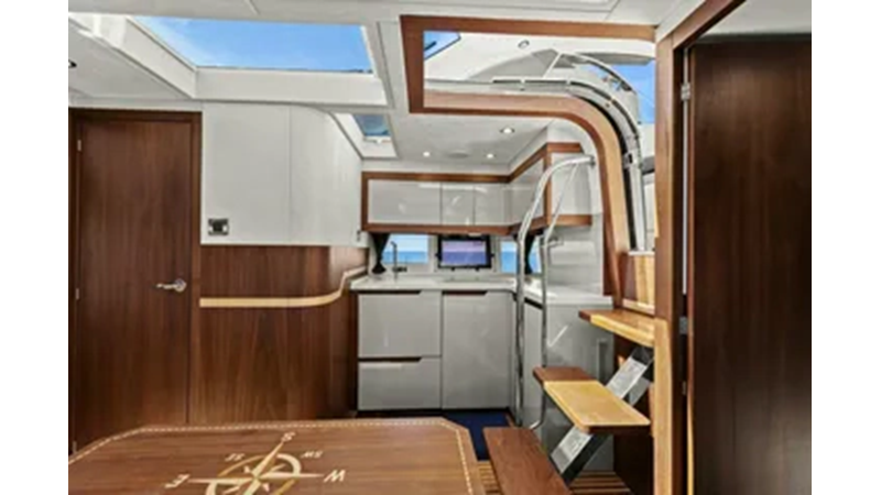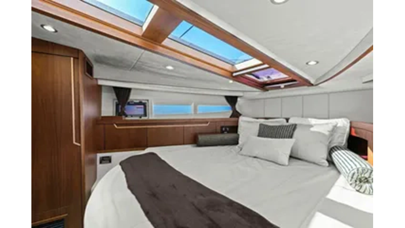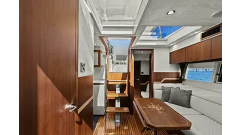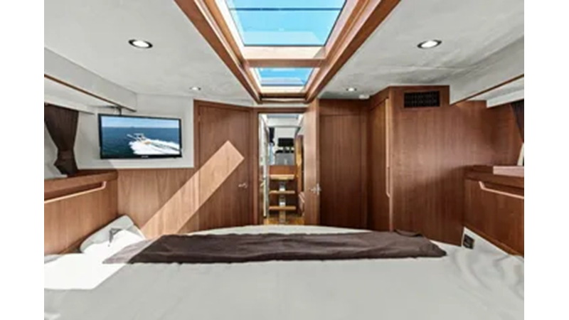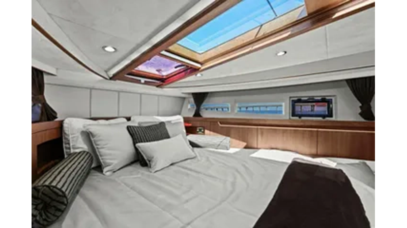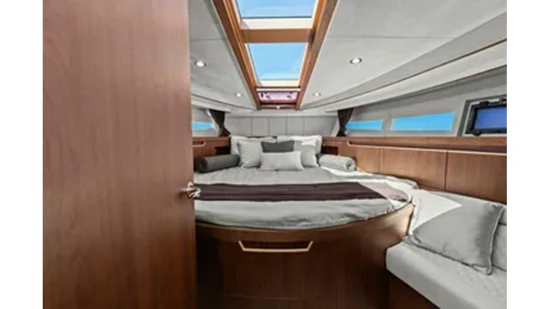- 2 cabins, 2 heads with ample headroom and elegant woodwork, generous natural light from skylights and hull windows